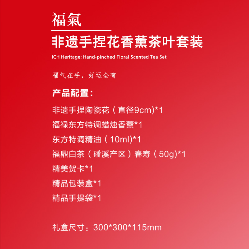 【产品配置】 非遗手捏陶瓷花(直径9cm)*1 福禄东方特调蜡烛香薰*1 东方特调精油(10ml)*1 福鼎白茶(磻溪产区)春寿(50g)*1 精美贺卡*1 精品包装盒*1 精品手提袋*1 【产品说明】 手捏陶瓷花+香薰+福鼎白茶,工艺与品质兼具; 红运礼盒包装,适配商务、新年礼赠场景; 多品类组合,礼赠诚意足; 福鼎白茶磻溪产区,茶叶品质有保障; 非遗工艺加持,礼品兼具文化与收藏价值。