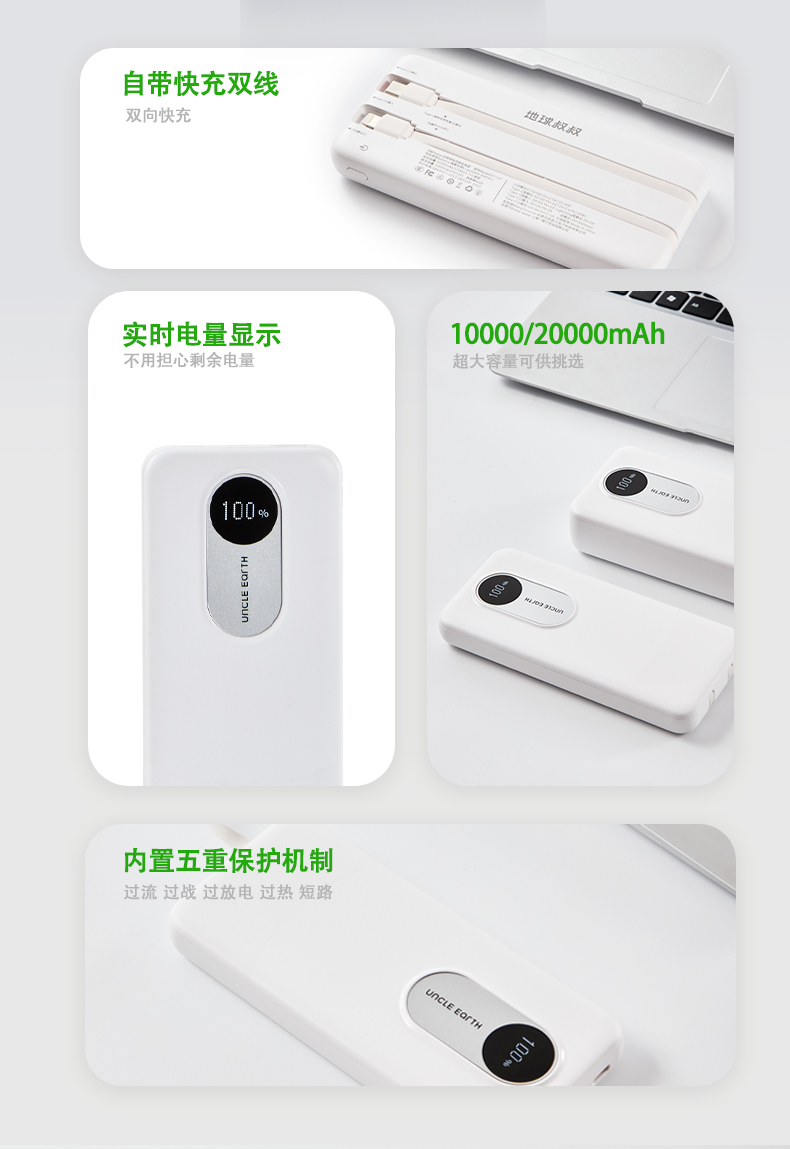 1.由回收ABS塑料制成,两种型号:10000毫安/20000毫安大容量电芯,兼顾环保理念与耐用质感;机身自带LED数显屏幕,剩余电量实时清晰可见,支持22. 5W快速充电与Type-C双向快充,并且配备Lightning和Type- -C双规格数据线,可为笔记本电脑、手机等设备提供高效充电,满足移动办公需求;内置过流、过载、过放电、过热及短路五重保护机制,可规避异常情况,为使用保驾护航。 2.符合3C认证标准。 3.产品尺寸:15 x 7 x 3厘米
