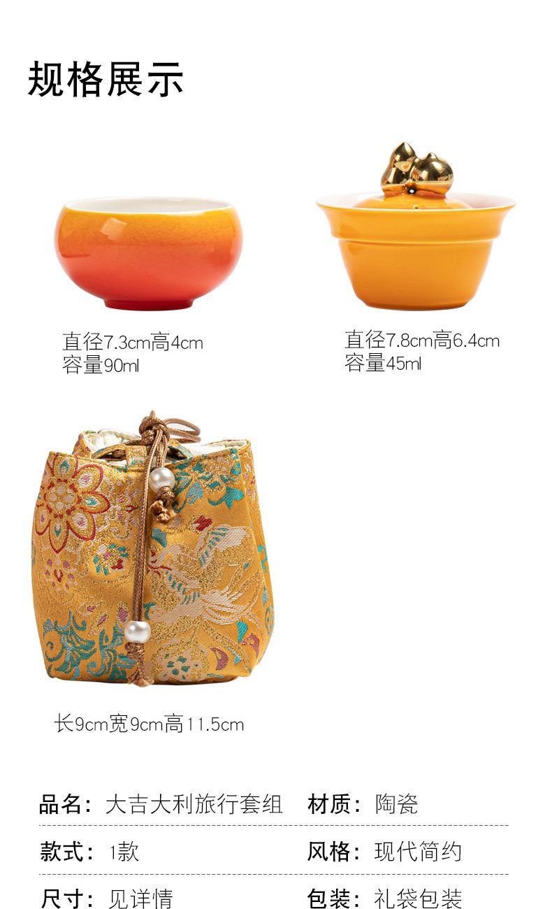 壶:7.8*6.4厘米45ml 品茗杯:7.3*4厘米90ml 旅行袋:9*9*11.5厘米 造型形象生动,寓意美好, 精致便携,品质保障,甄选好礼