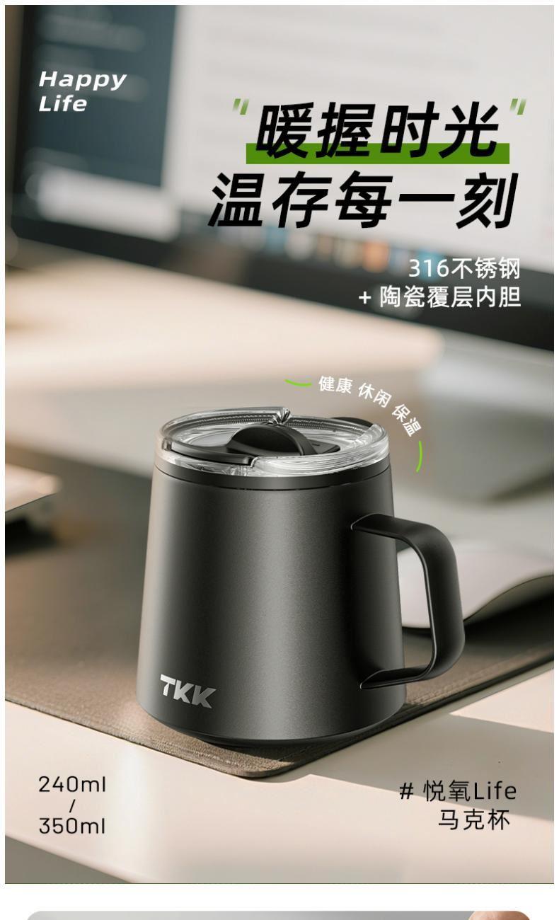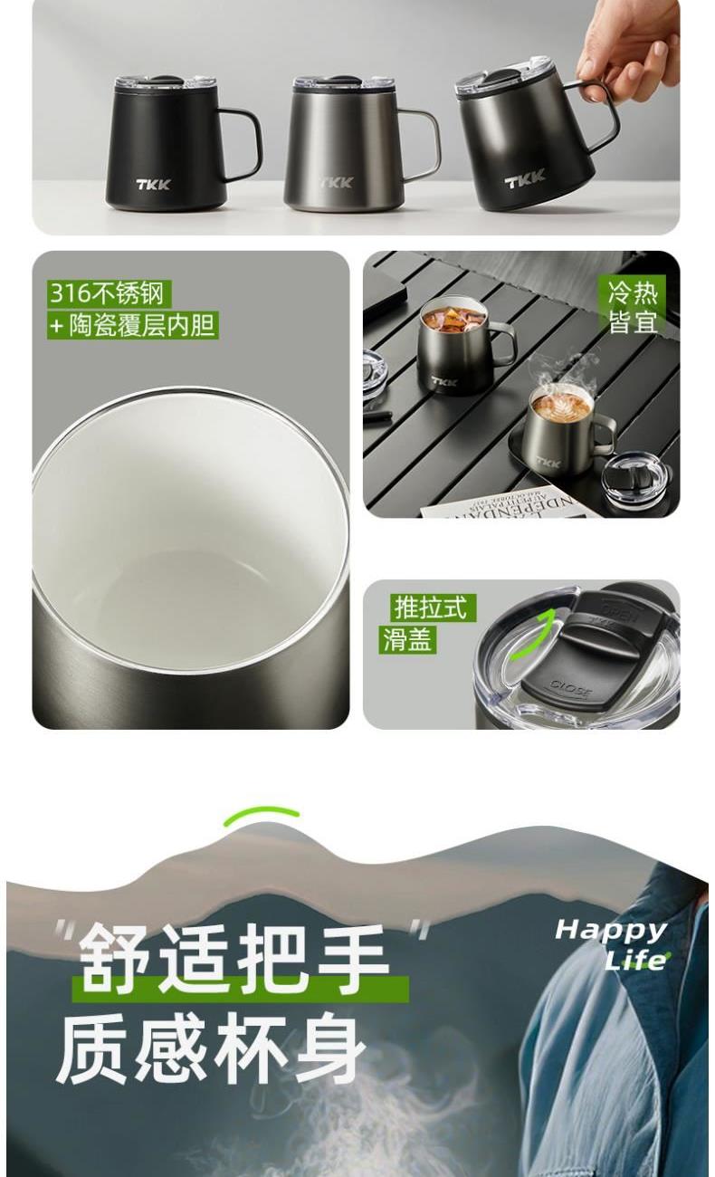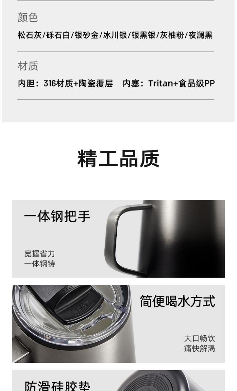 商品容量:240ml 杯身材质:316不锈钢 杯盖材质:PP+PC 商品净重:240g 1.316不锈钢用材内胆+陶瓷覆层,耐腐蚀 2.宽大杯口,方便冲泡挂耳咖啡,冲洗清洁更简单,泡饮不受限 3.体钢把手,宽握省力,一体钢铸 4.防滑硅胶垫,静音放置,防滑不易倒 5一键滑盖,直饮&敞饮多种饮水选择
