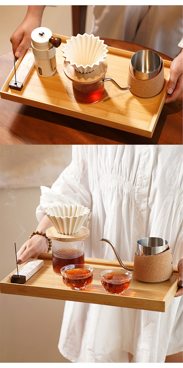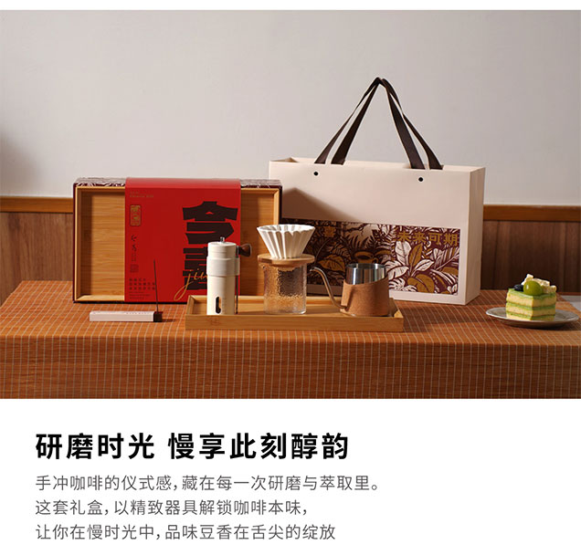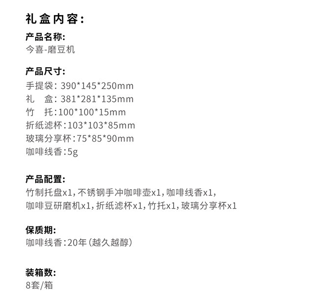 产品尺寸: 手提袋: 390*145*250mm 礼盒: 381*281*135mm 竹托:100*100*15mm 折纸滤杯:103*103*85mm 玻璃分享杯:75*85*90mm 咖啡线香:5g 产品配置: 竹制托盘x1,不锈钢手冲咖啡壶x1, 咖啡线香x1,咖啡豆研磨机x1, 折纸滤杯x1,竹托x1,玻璃分享杯x1