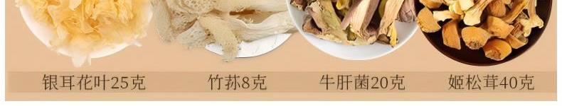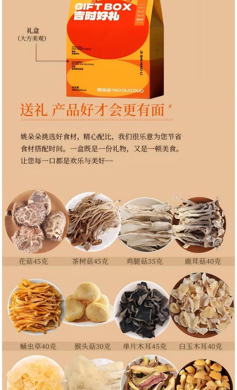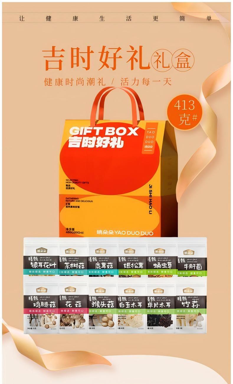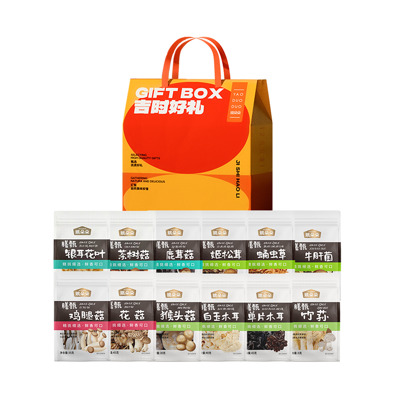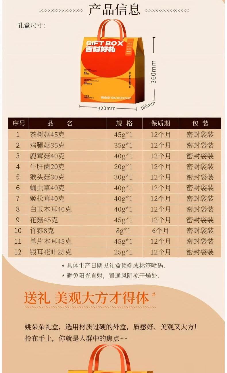 茶树菇45克 鸡腿菇35克 鹿茸菇40克 牛肝菌20克 猴头菇30克 蛹虫草40克 姬松茸40克 白玉木耳40克 花菇45克 竹荪8克 单片木耳45克 银耳花叶25克 包装盒-吉时好礼礼盒