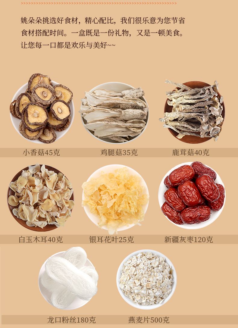 小香菇45克 鸡腿菇35克 鹿茸菇40克 白玉木耳40克 银耳花叶25克 新疆灰枣120克 龙口粉丝180克 纯燕麦片500克 包装盒-鸿运臻礼