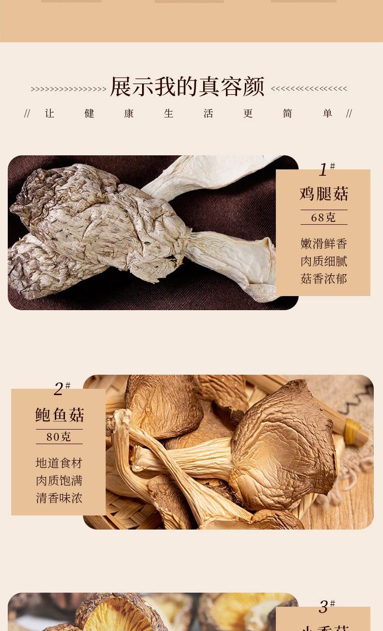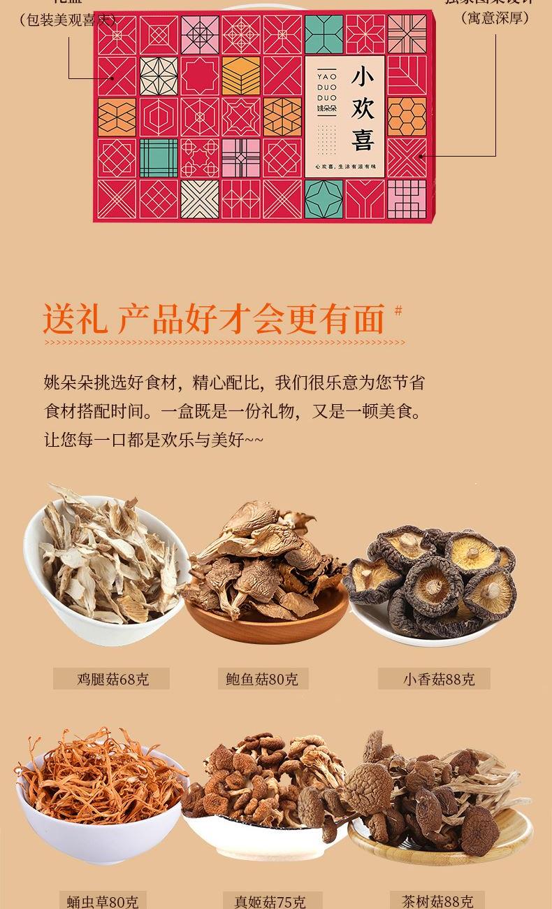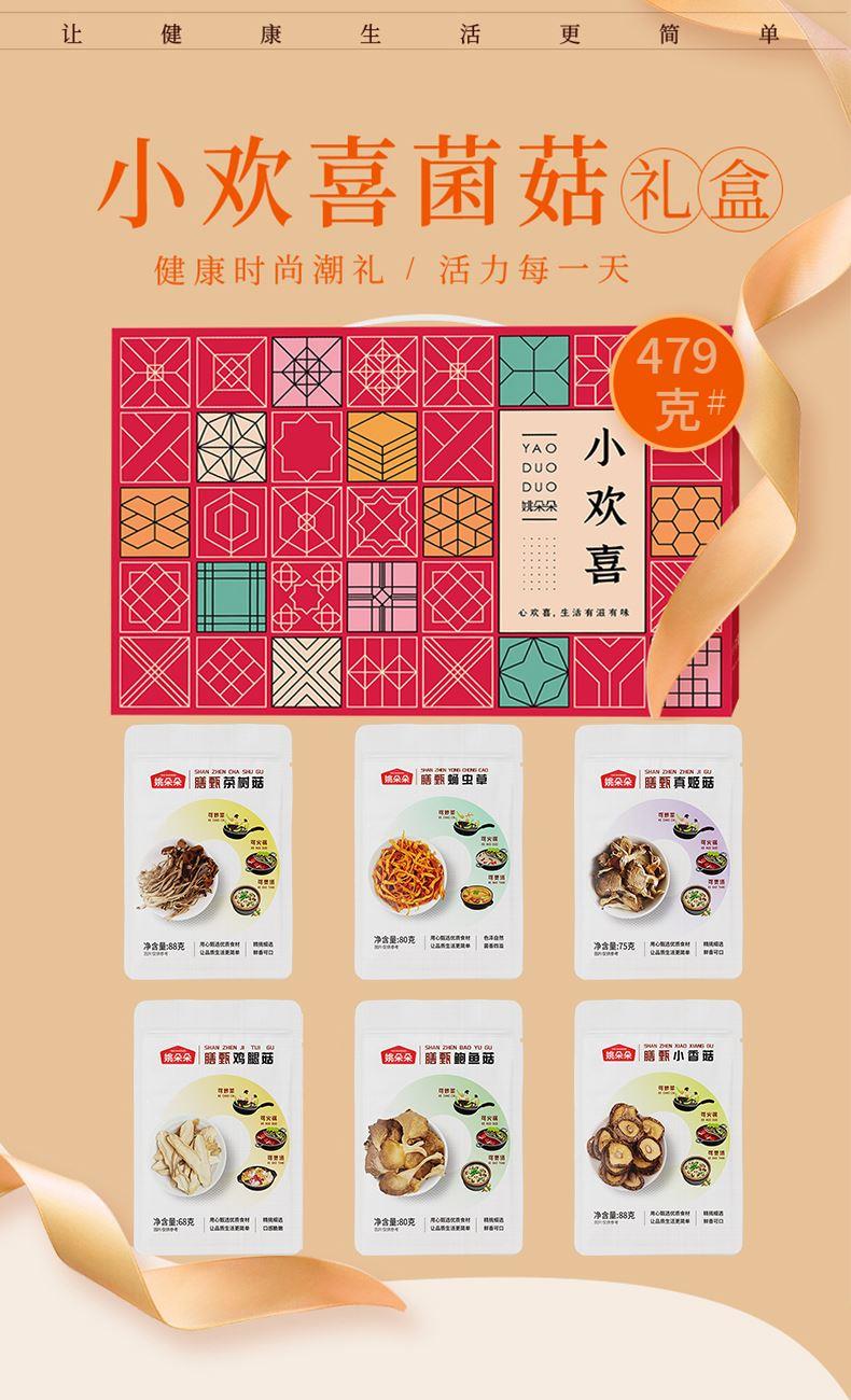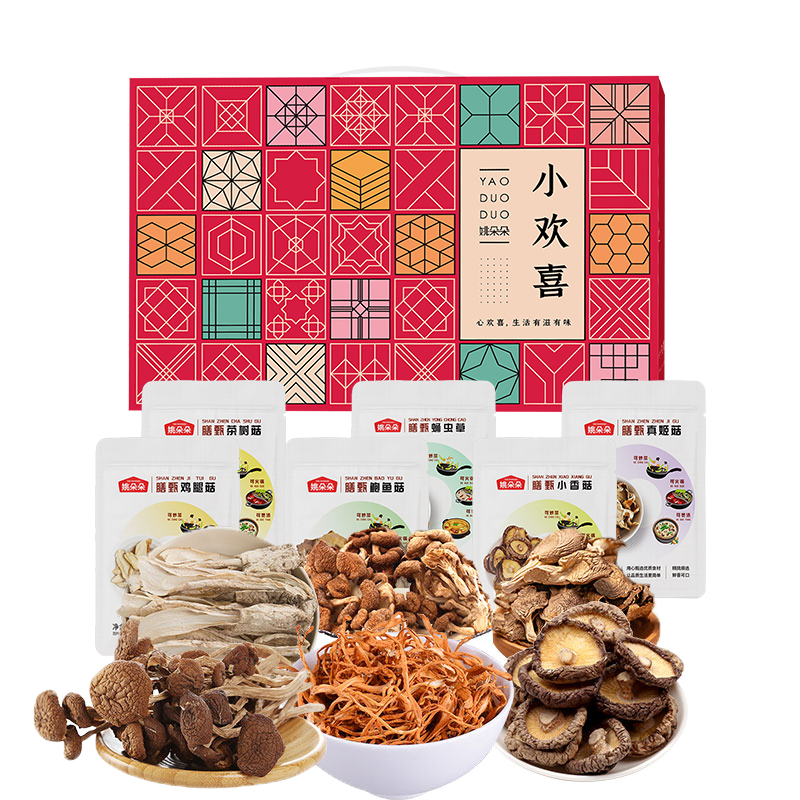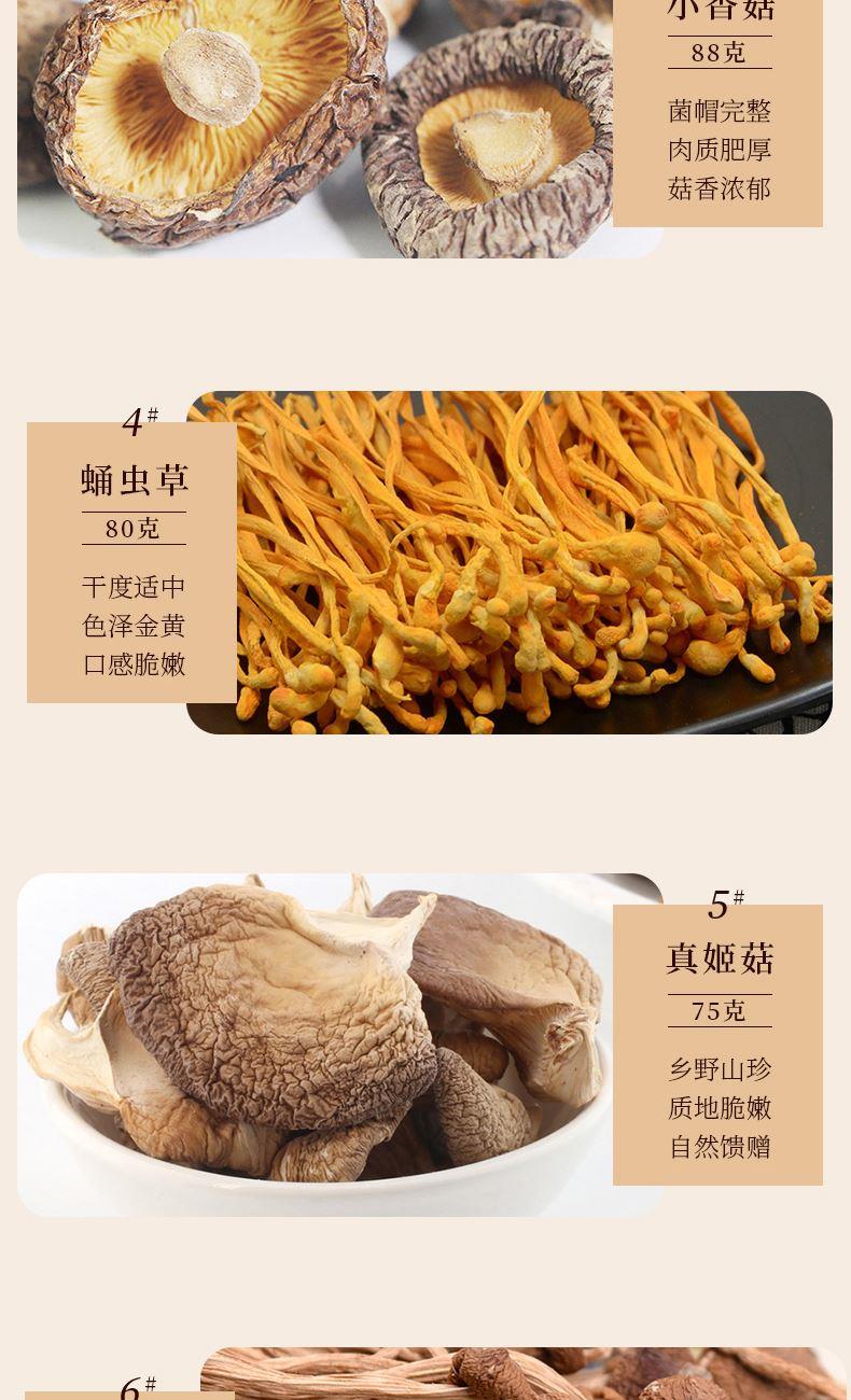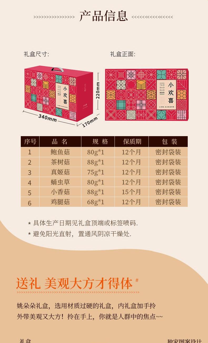 鲍鱼菇80克 茶树菇88克 鸡腿菇68克 小香菇88克 蛹虫草80克 真姬菇75克 包装盒-小欢喜
