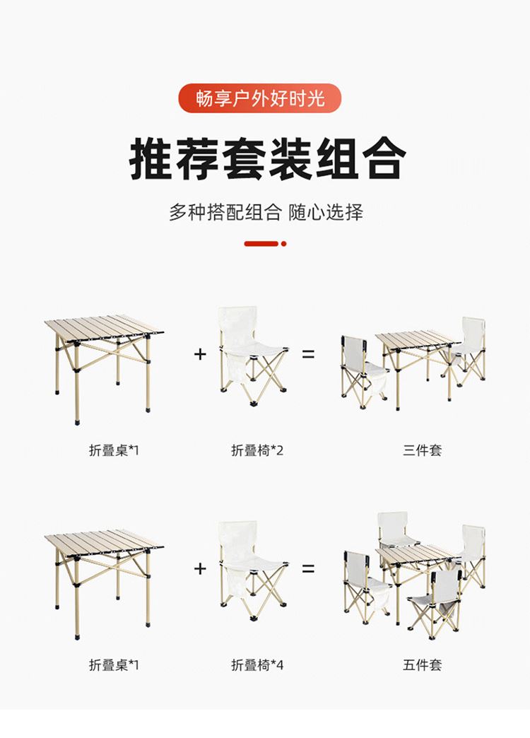 材质: 600D牛津布 +铝合金板 颜色:米白 规格:三件套(一桌二椅)/五件套(一桌四椅) 净重:4kg(三件套)/6.8kg(五件套) 承重:150kg 1、铝合金折叠桌+牛津布折叠椅,高承重,经久耐用; 2、一桌四椅、家庭亲友露营小聚必备; 3、折叠收纳,不占空间 ; 4、INS风米白色系,高颜值干净舒适;