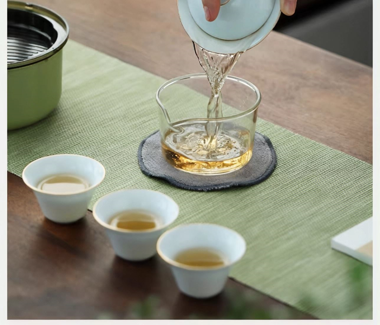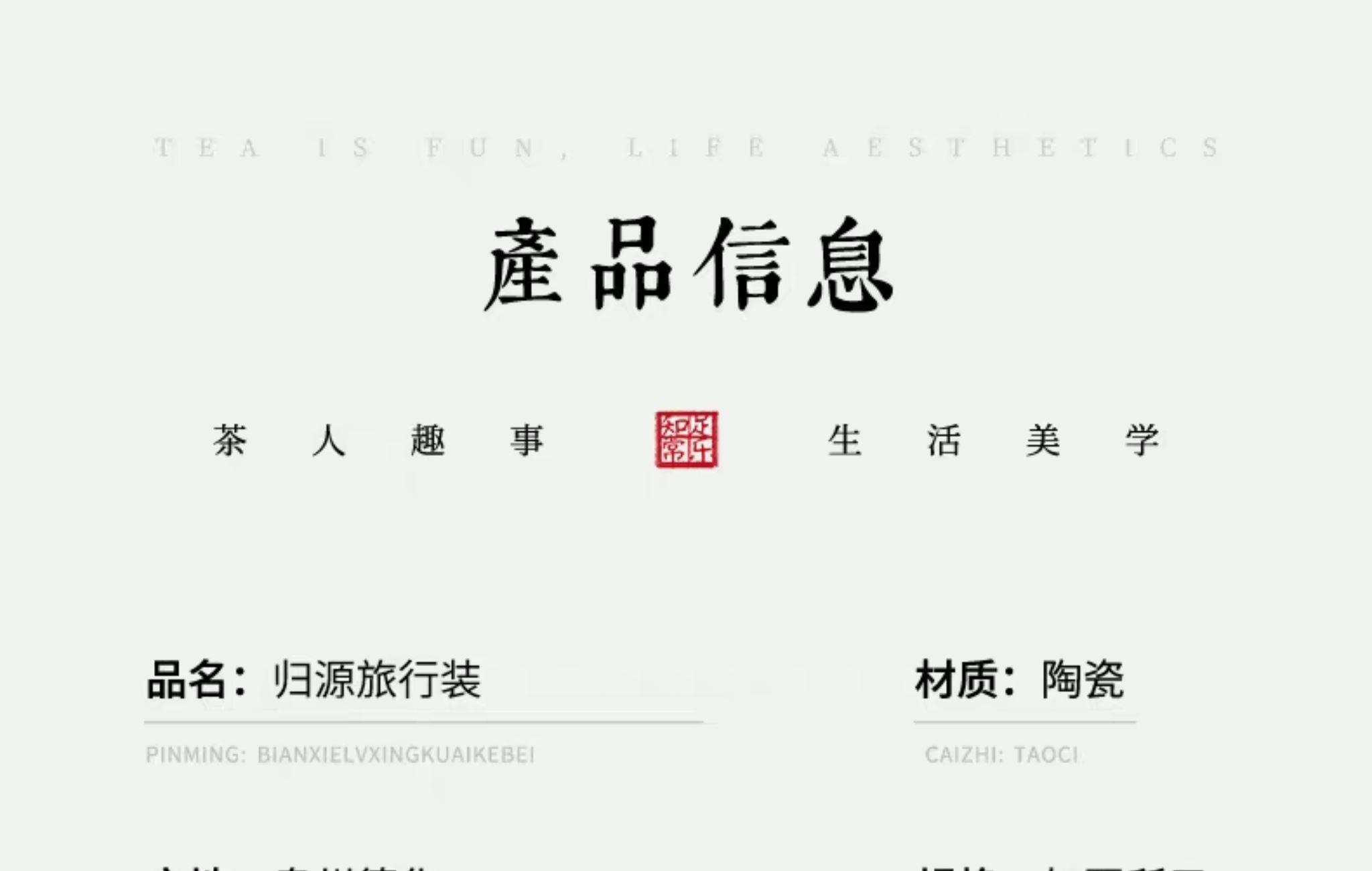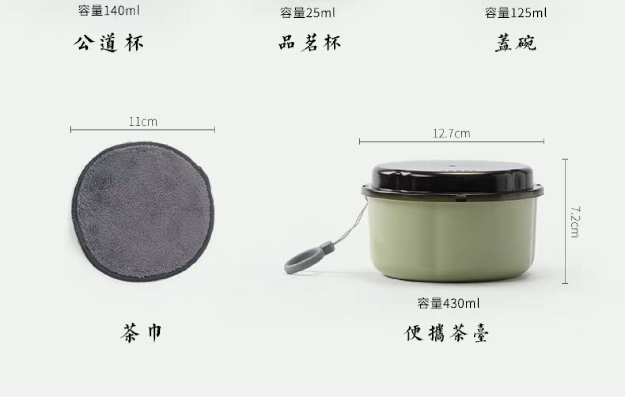 配置:盖碗*1,茶杯*3,玻璃公道*1,茶巾*1. 尺寸:盖碗8.6*7.5cm 容量125ml, 品茗杯5.8*3.4cm 容量25ml, 公道8.7*5.4cm 容量140ml, 便携茶台12.7*7.2cm 容量430ml。 礼盒长18.5cm宽11.5cm高8.8cm。