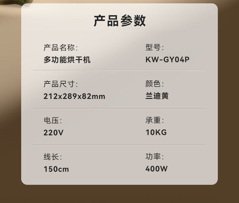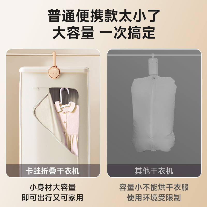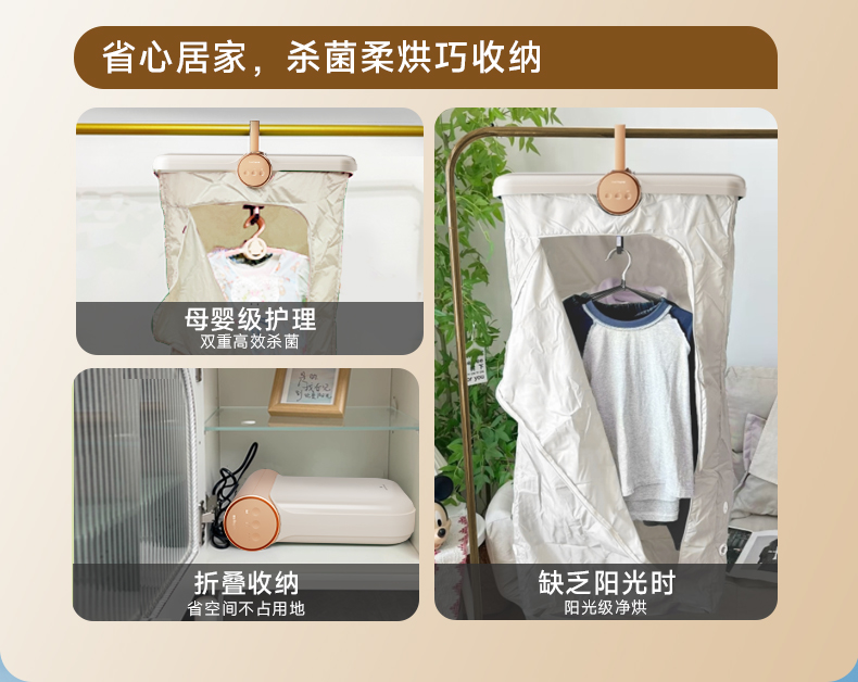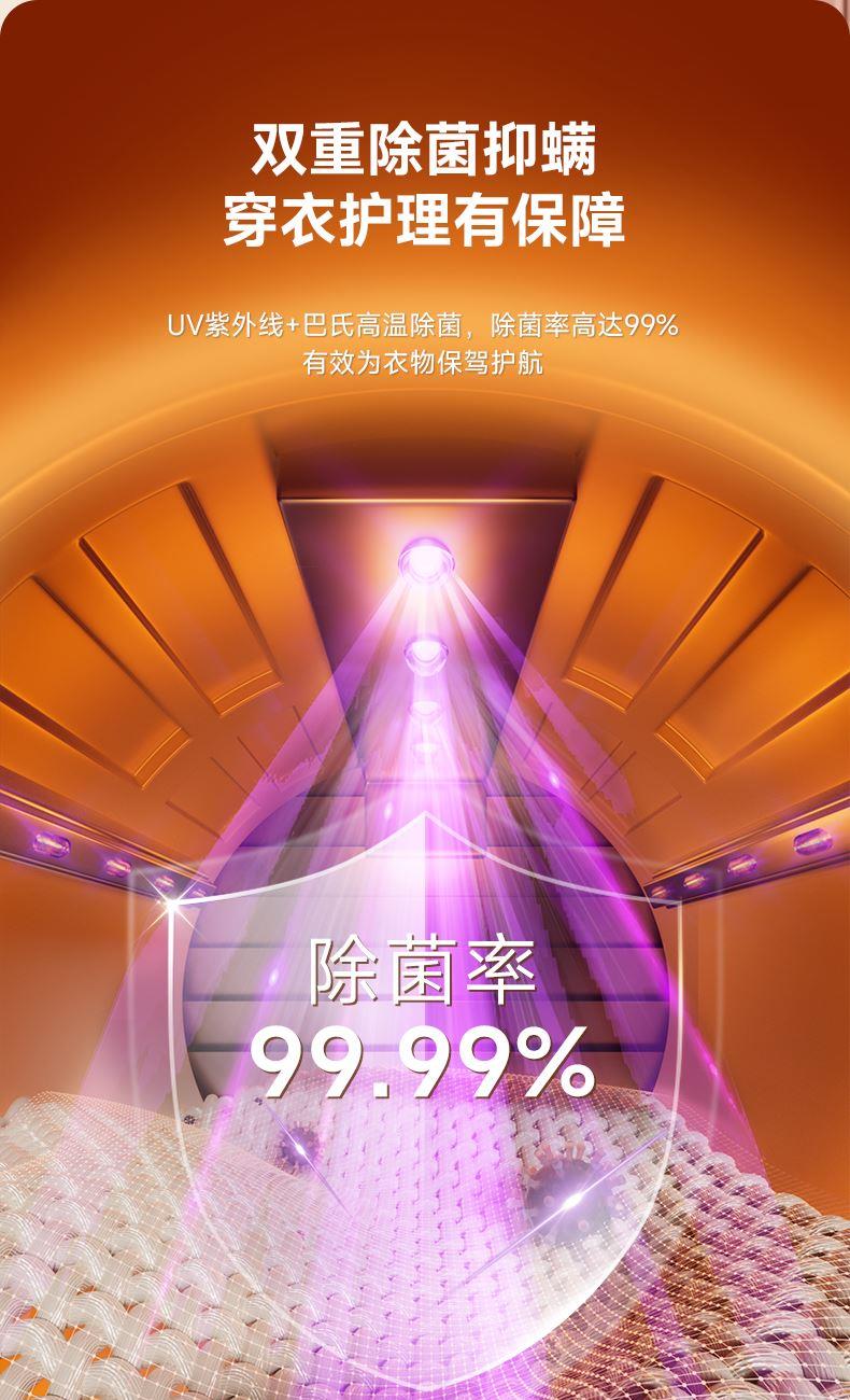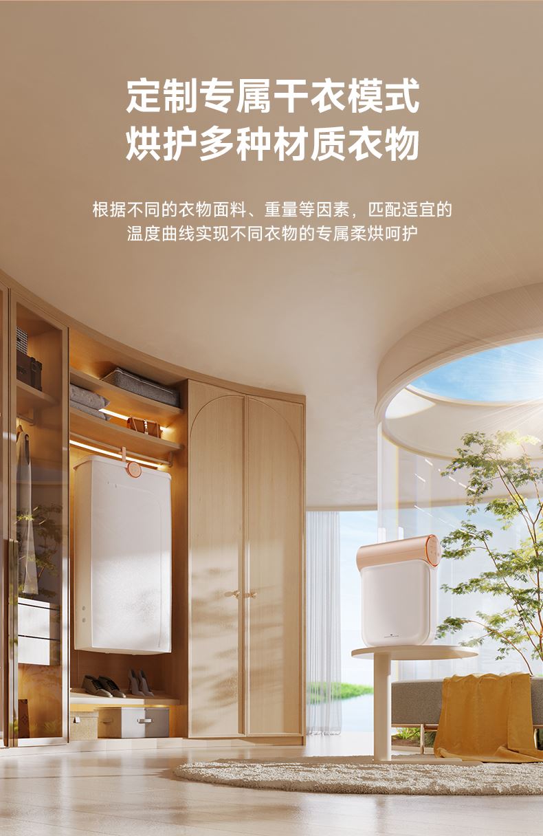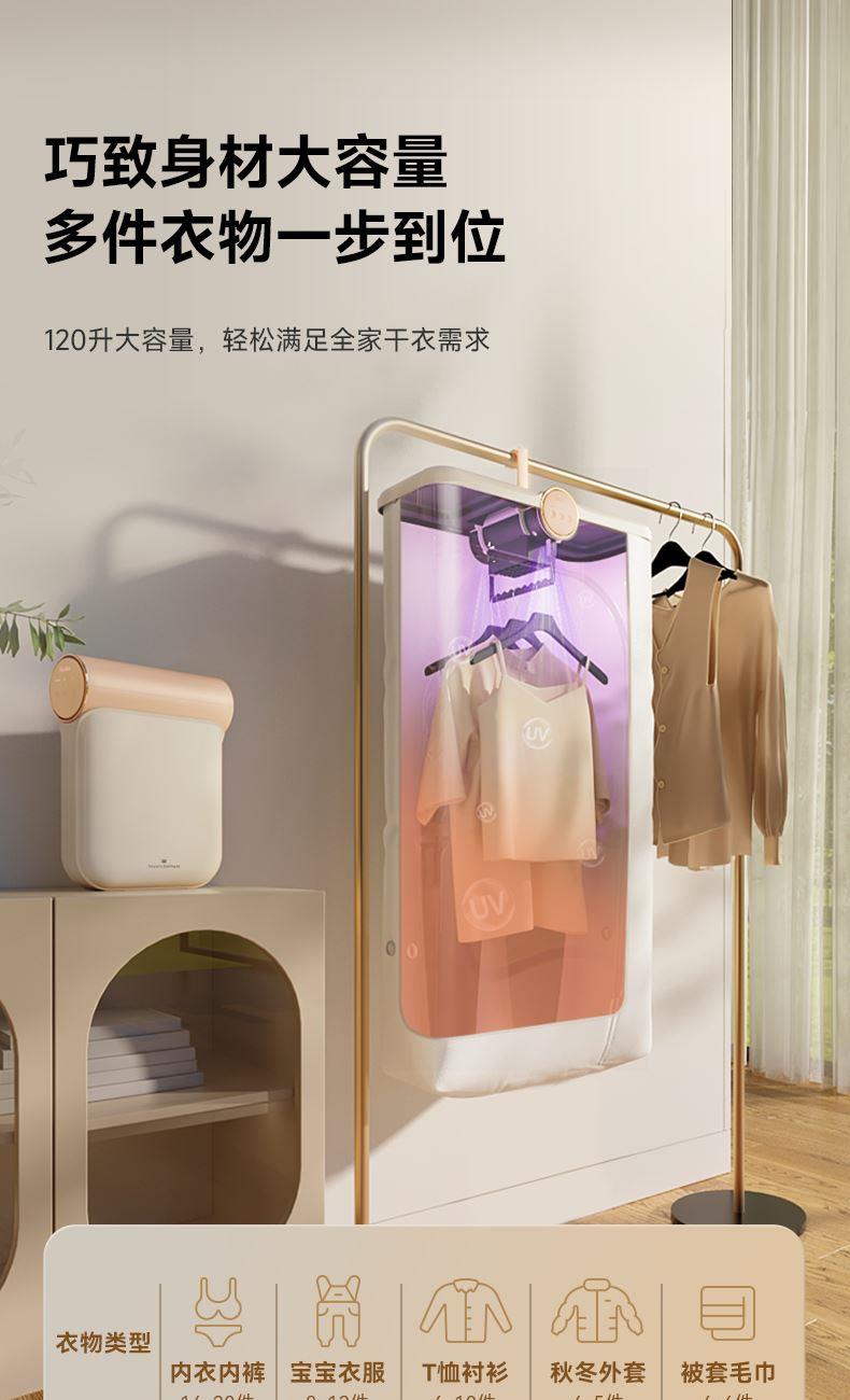 创新型结构设计,一体式免安装,即开即用,便捷收纳,收纳方便展开有型 巴氏高温+UV+臭氧,全链路深层净菌除味 PTC发热体搭载新创U-turbo闪烘技术,20min干透即烘即穿 双核涡轮风机带动热流,干衣更高效 3D热流覆盖穿透,衣物清爽蓬松 NTC实时监控,矜贵面料放心烘护 智能温控系统,节能低耗 1H~7H自由定时,8H自动关机