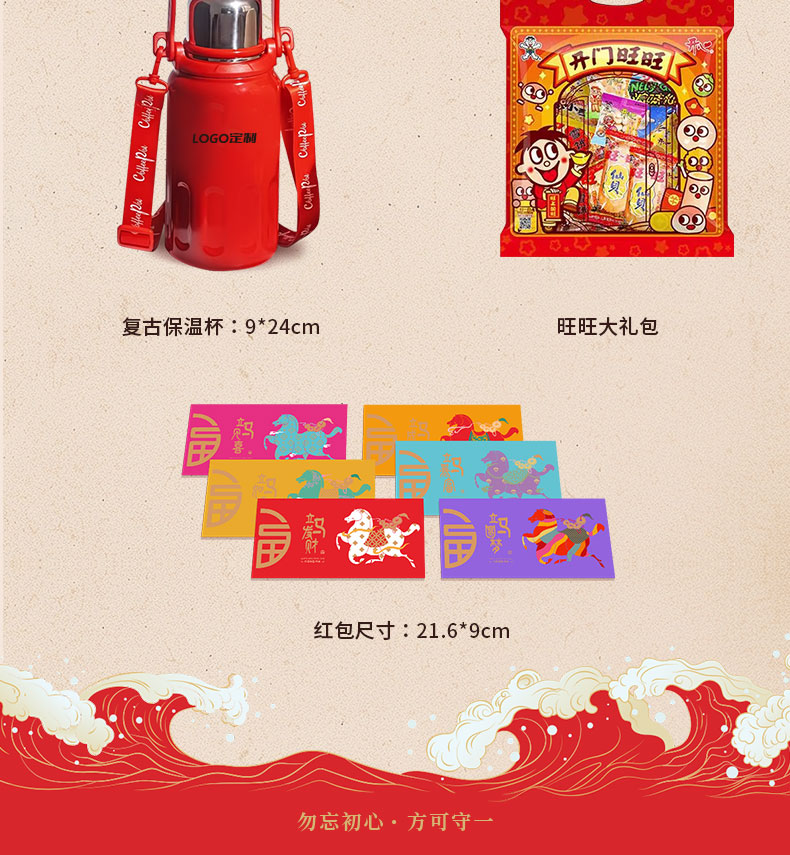 1.礼盒 2.旺旺大礼包 3.复古保温杯 4.马年红包*6 5.运动双肩包