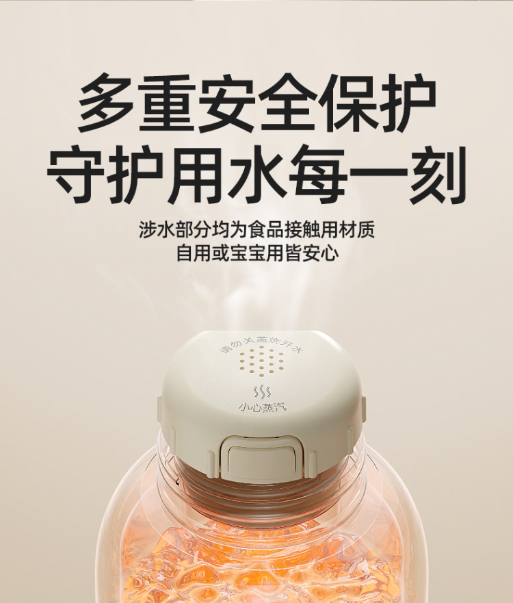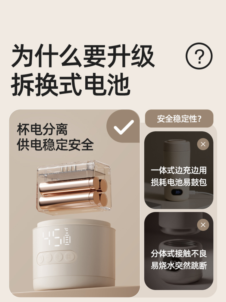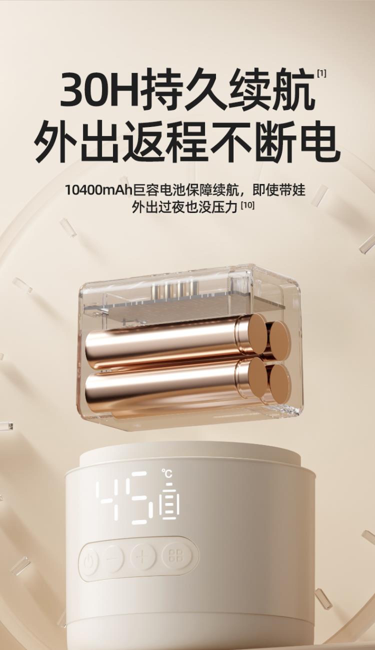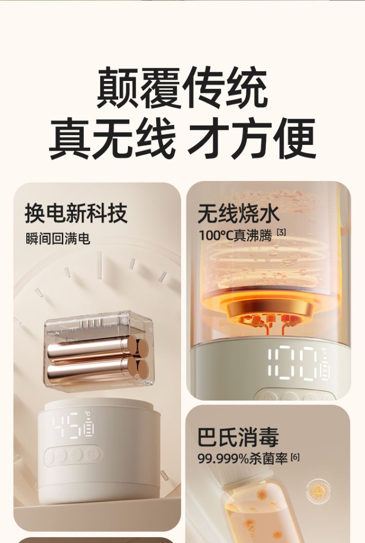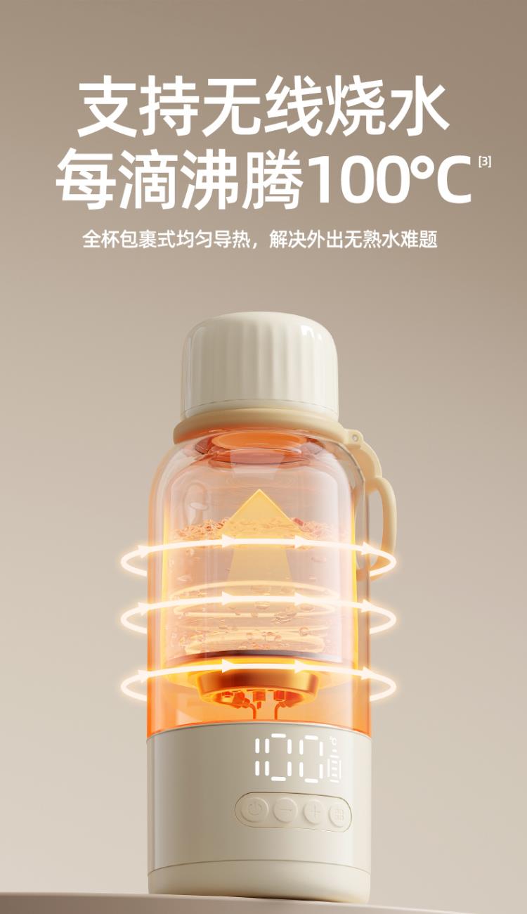 主要材质:PP+316不锈钢 电压:220V 功率:80W 容量:500ml 电池:10400mAh 1.无线烧水,不受场景位置限制 2.7档模式选择,21档控温; 3.NTC智能温控技术,自动测温控温; 4.AI芯片智能防护保障,防干烧、防漏电 5.电池灵活更换,外携无忧; 6.全球可用,可上飞机高铁 7.24小时全天候保温 8.电池支持多种充电方式(支持快充协议、车载充、充电宝) 9.设计细节:防洒导流嘴、泄压口