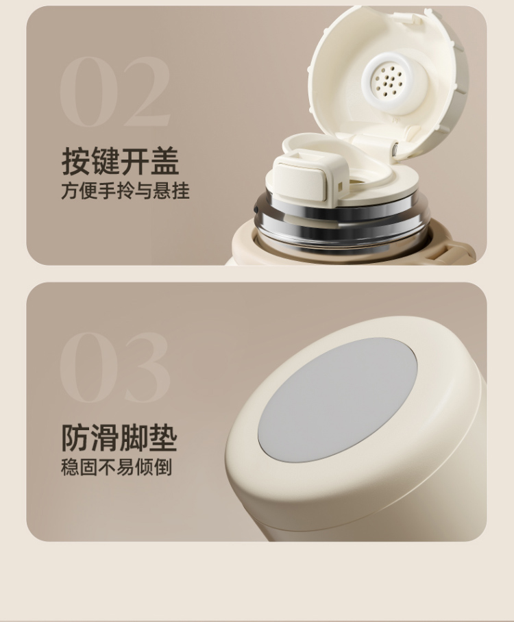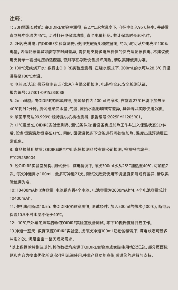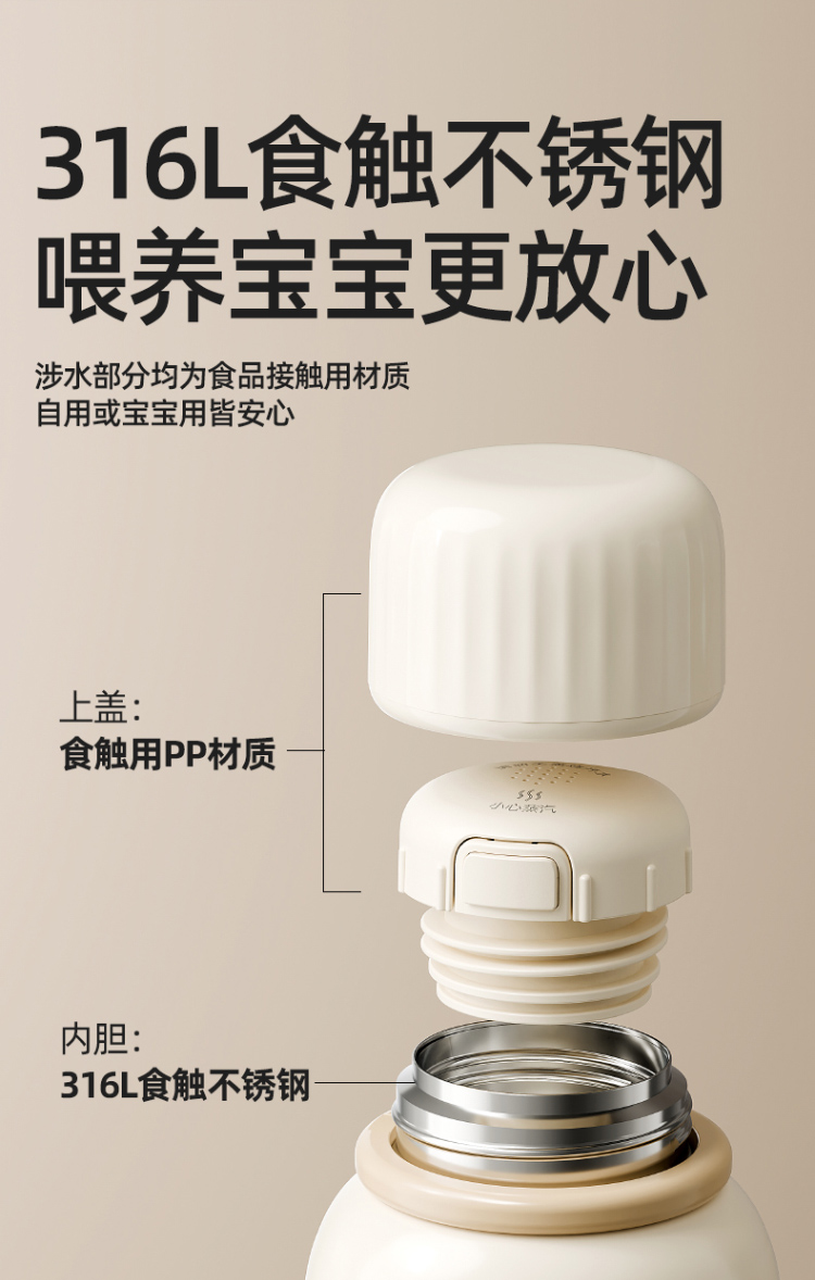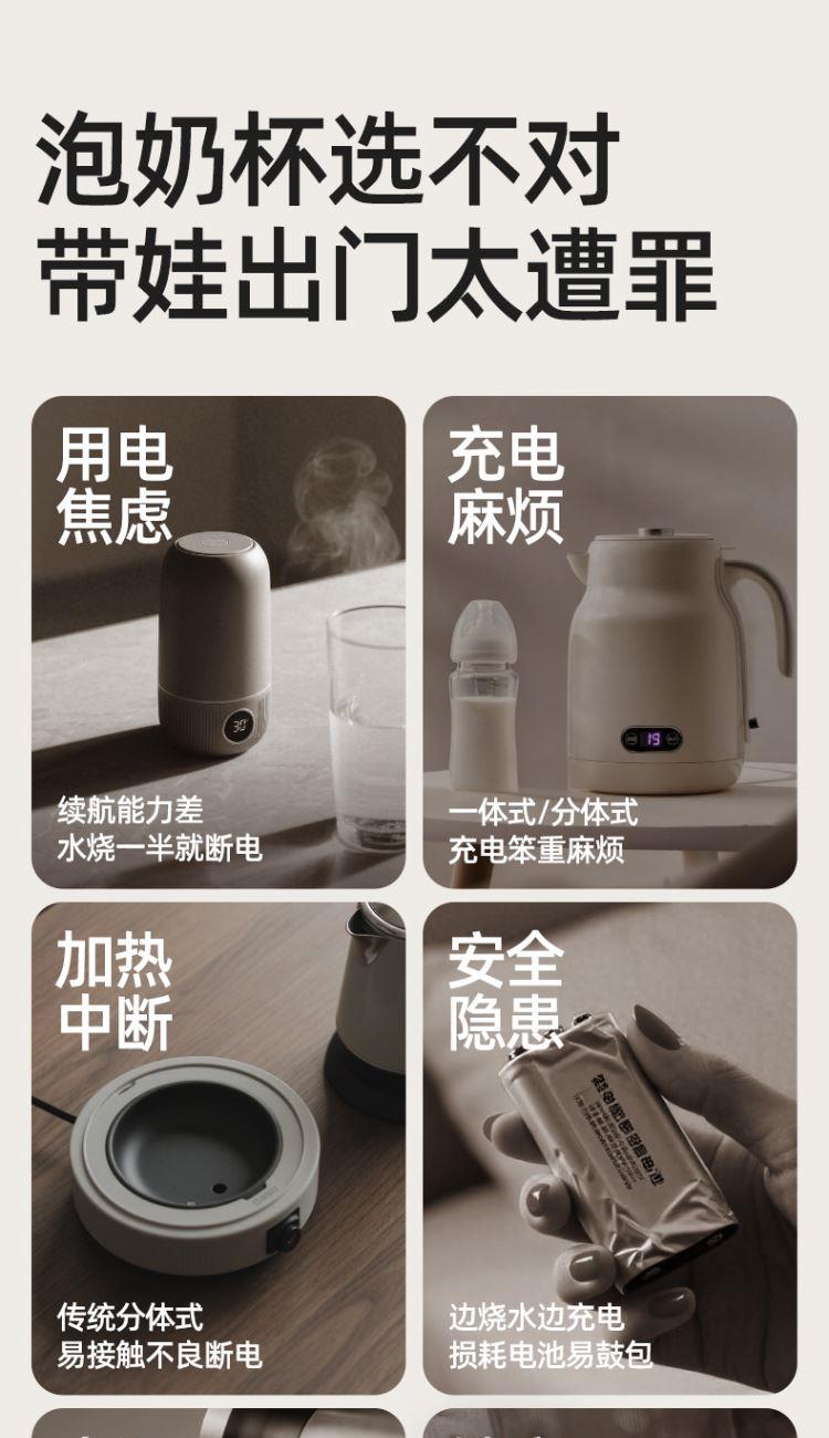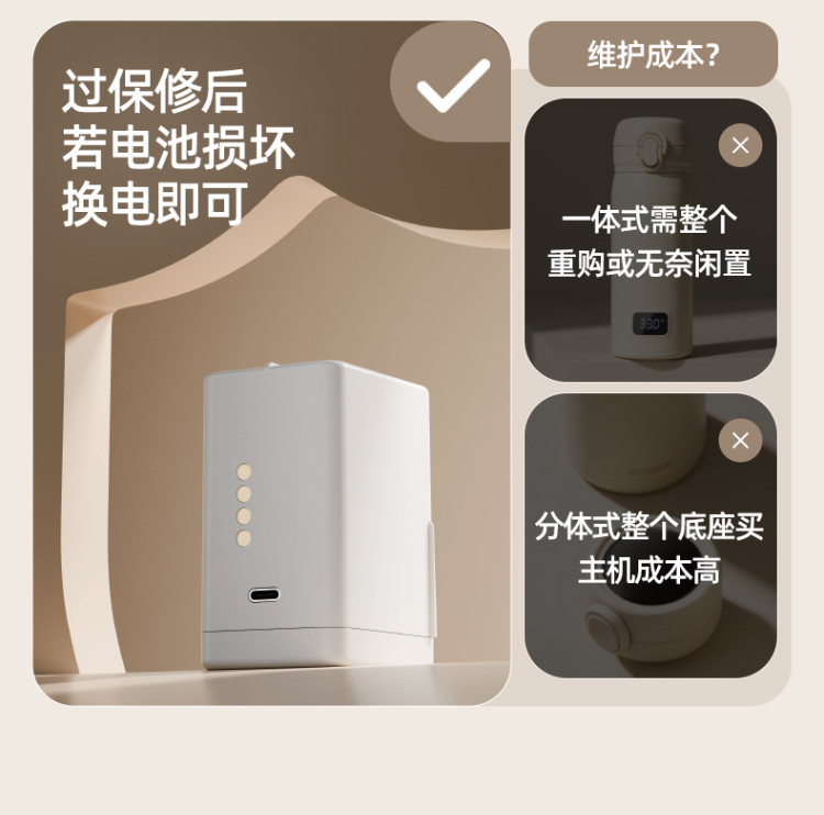 主要材质:PP+316不锈钢 电压:220V 功率:80W 容量:500ml 电池:10400mAh 1.无线烧水,不受场景位置限制 2.7档模式选择,21档控温; 3.NTC智能温控技术,自动测温控温; 4.AI芯片智能防护保障,防干烧、防漏电 5.电池灵活更换,外携无忧; 6.全球可用,可上飞机高铁 7.24小时全天候保温 8.电池支持多种充电方式(支持快充协议、车载充、充电宝) 9.设计细节:防洒导流嘴、泄压口