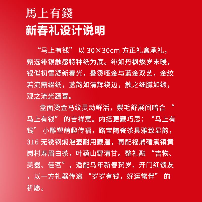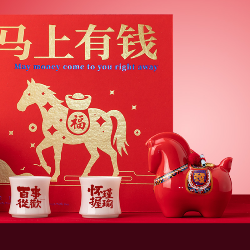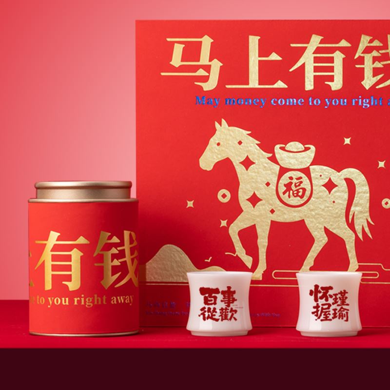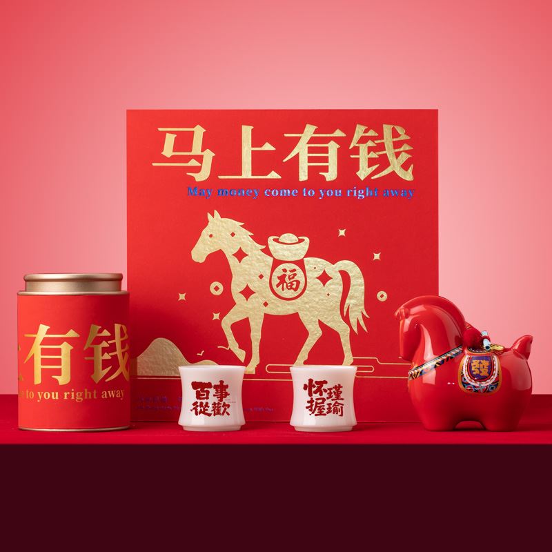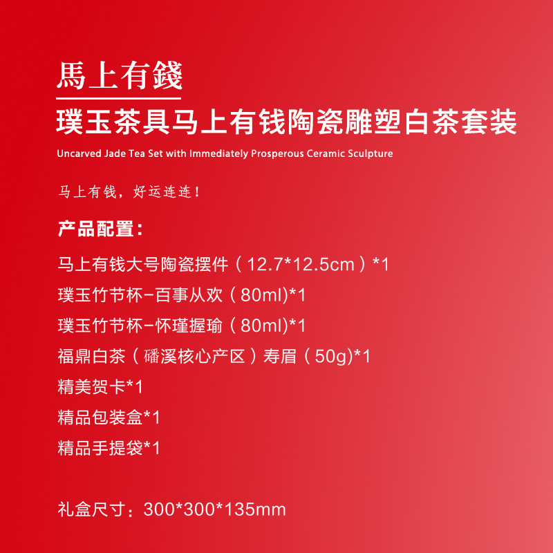 【产品配置】 马上有钱大号陶瓷摆件(12.7*12.5cm)*1 璞玉竹节杯-百事从欢(80ml)*1 璞玉竹节杯-怀瑾握瑜(80ml)*1 福鼎白茶(磻溪核心产区)寿眉(50g)*1 精美贺卡*1 精品包装盒*1 精品手提袋*1 【产品说明】 寓意吉祥:马上有钱,龙马精神钱程似锦; 品类丰富,焖泡壶、陶瓷摆件等多品类齐全; 茶品优质:福鼎潘溪核心区寿眉,口感佳; 礼赠体面:精美包装+贺卡+手提袋,档次高; 实用兼具:茶具好用,摆件有意义,茶可品饮。
