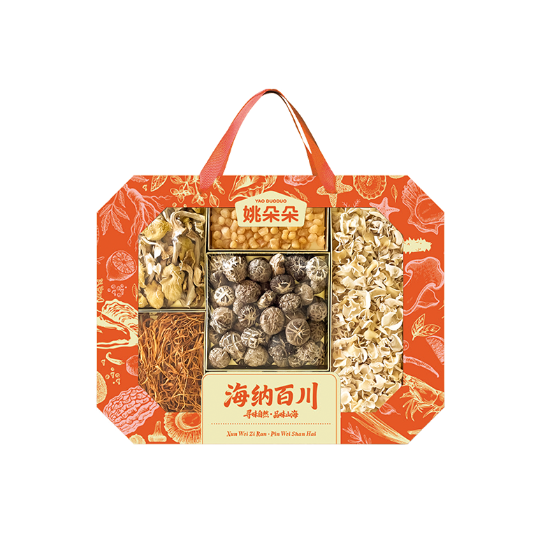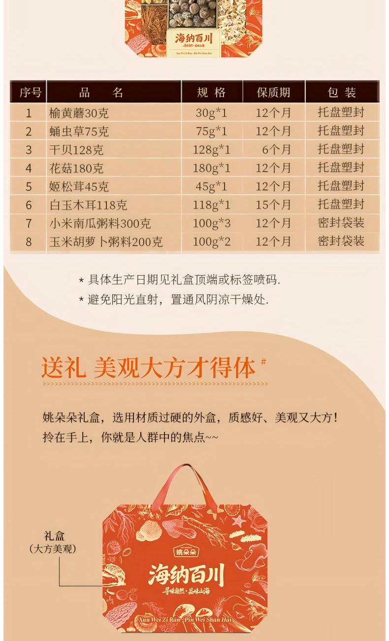 榆黄蘑30克 蛹虫草75克 干贝128克 花菇180克 姬松茸45克 白玉木耳118克 小米南瓜粥料100克*3袋 玉米胡萝卜粥料100克*2袋 海纳百川礼盒