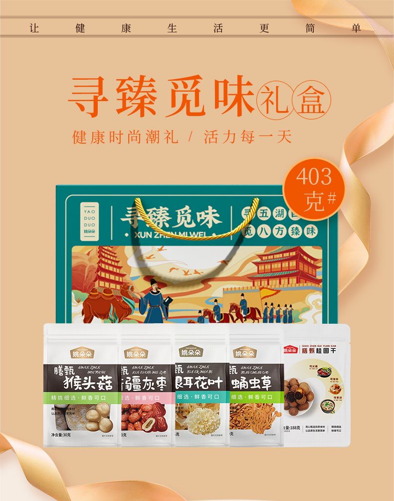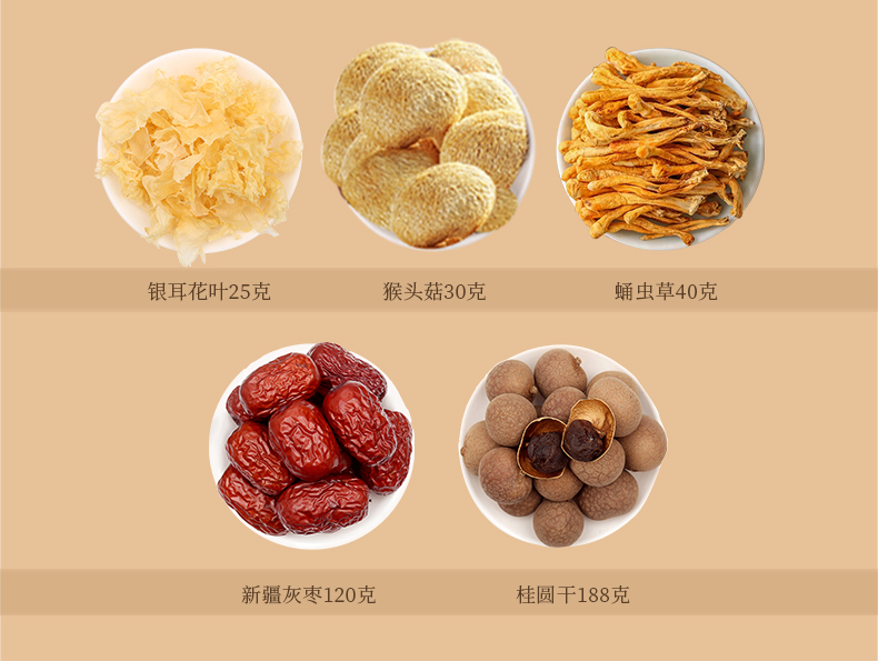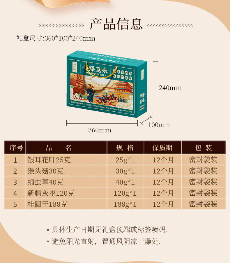 银耳花叶25克 猴头菇30克 蛹虫草40克 新疆灰枣120克 桂圆干188克 寻臻觅味礼盒