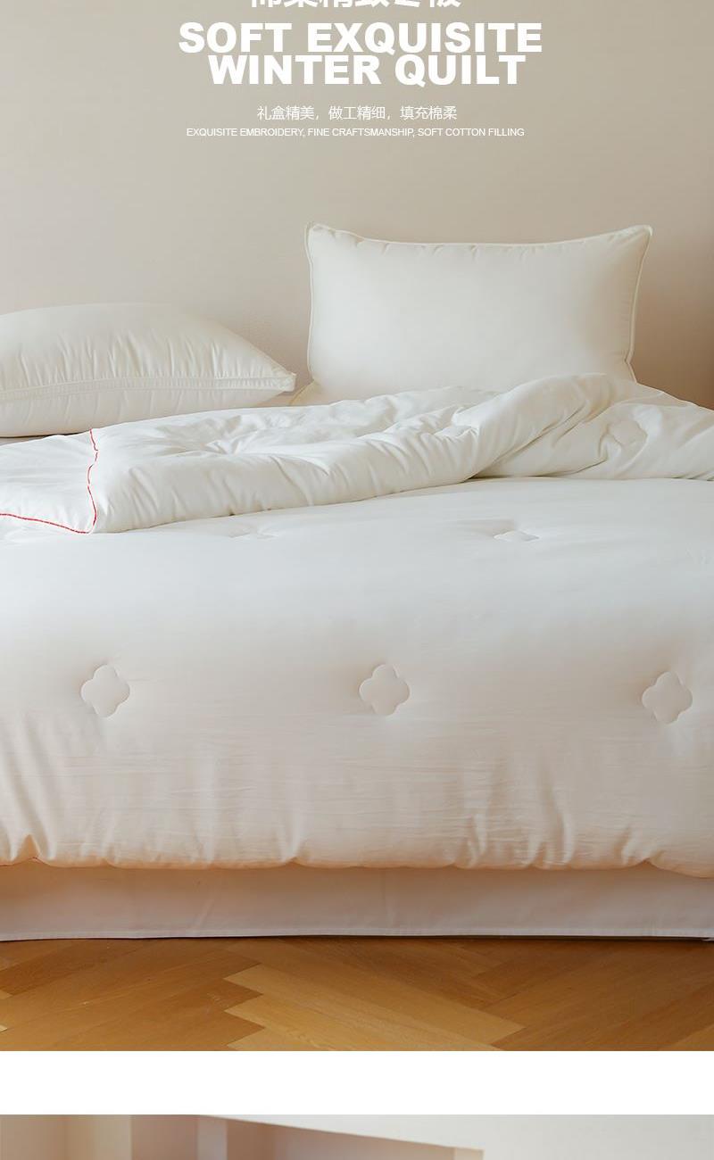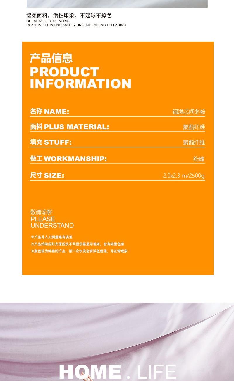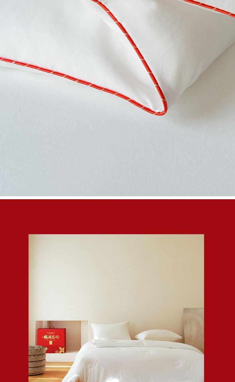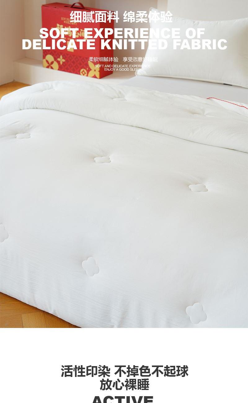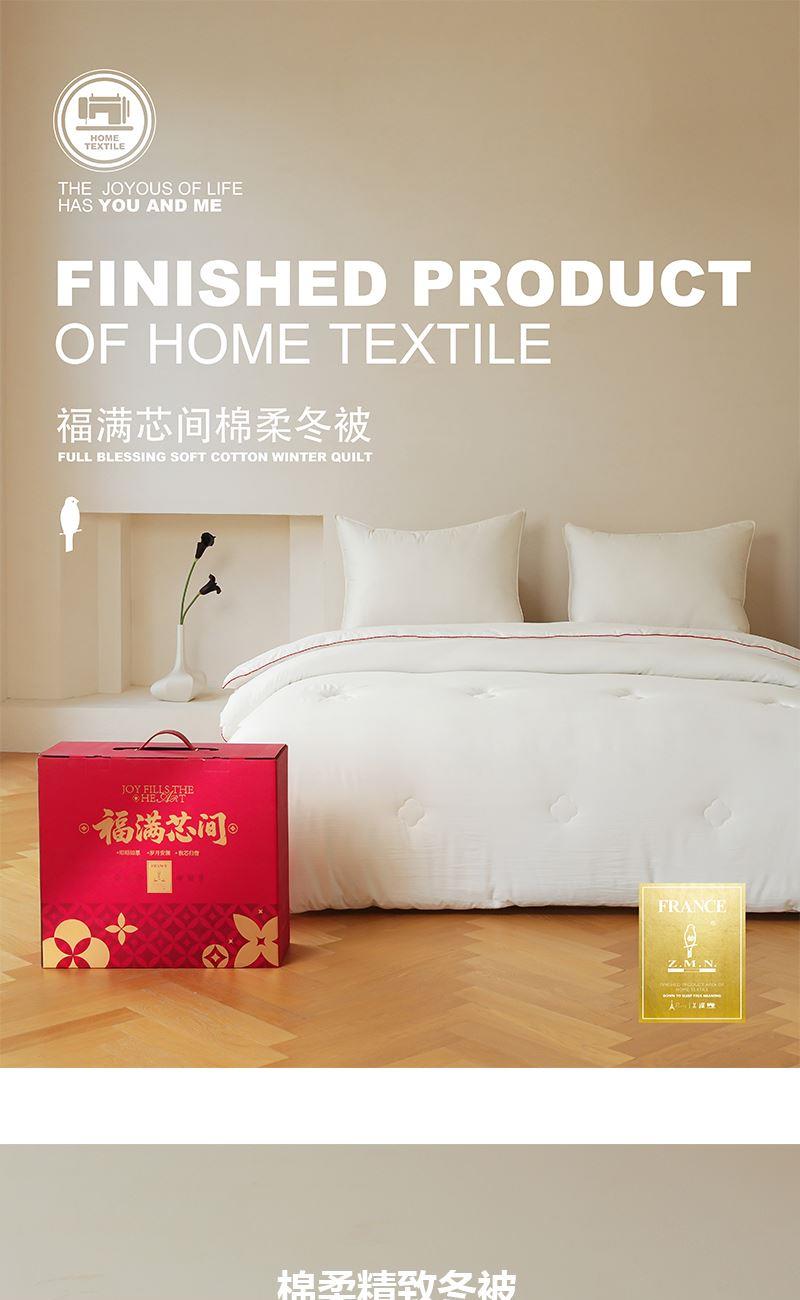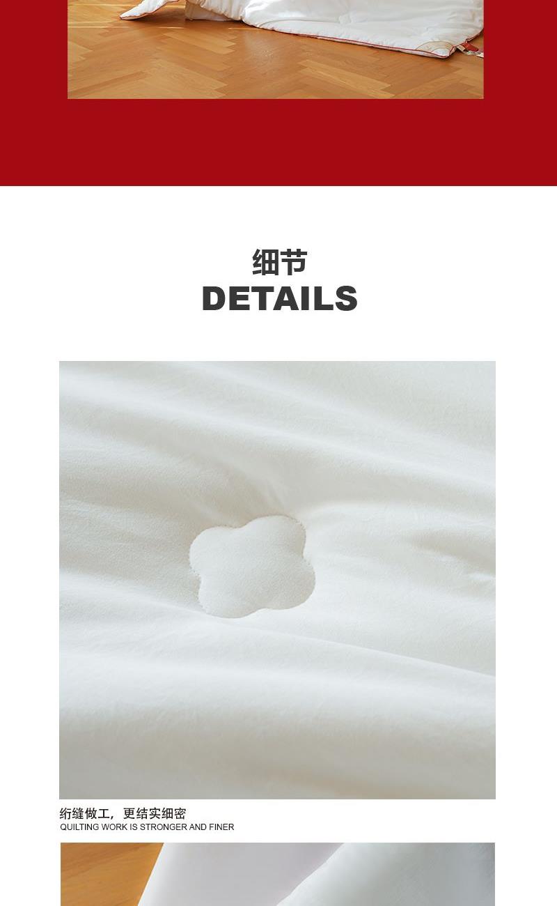 尺寸:200x230cm 重量:2500g 面料:超柔磨毛 填充物:整张超细纤维 卖点: 1、福满芯间一 ”被”子是每个传统中国人的美好愿望。 2、面料采用进口意大利陶瓷磨毛工艺,软糯细腻,亲肤柔顺。 3、填充采用整张一体式超细纤维,久用不变形,更加保暖。 4、精美喜庆烫金礼盒,细节处处彰显品质。