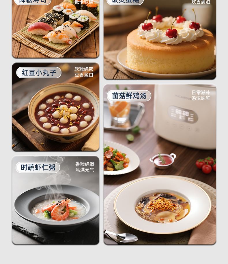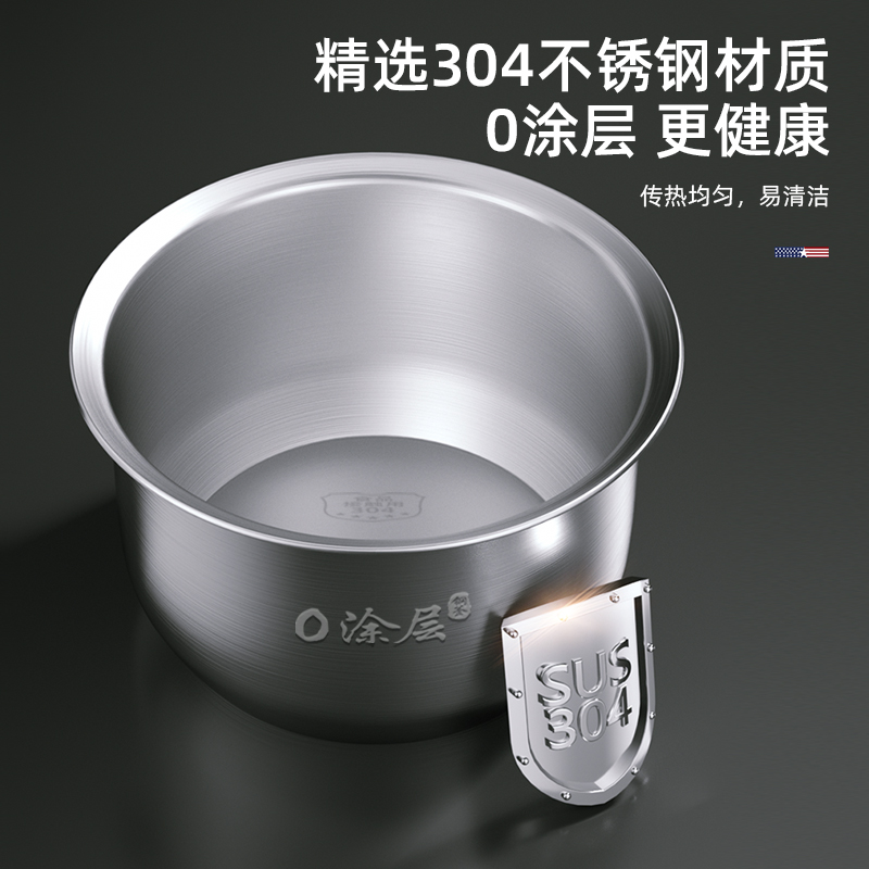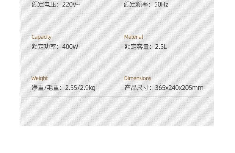 额定功率:400W 额定容量:2.5L 额定电压:220V~ 额定频率:50Hz 产品净重:2.55kg 产品毛重:2.9kg 整箱重量:12.9kg 0涂层内胆304不锈钢0涂层内胆更健康,2.5L精巧容量满足私享/小聚; 健康低糖饭304不锈钢蒸胆,米汤分离,低糖饭香而不甜; 多功能&24h预约8大智能触控菜单,24h智能预约,烹饪时间随心掌控; 配置304不锈钢内胆+304不锈钢降糖内胆。
