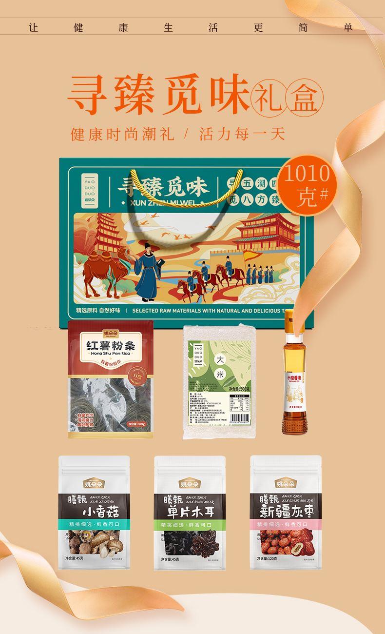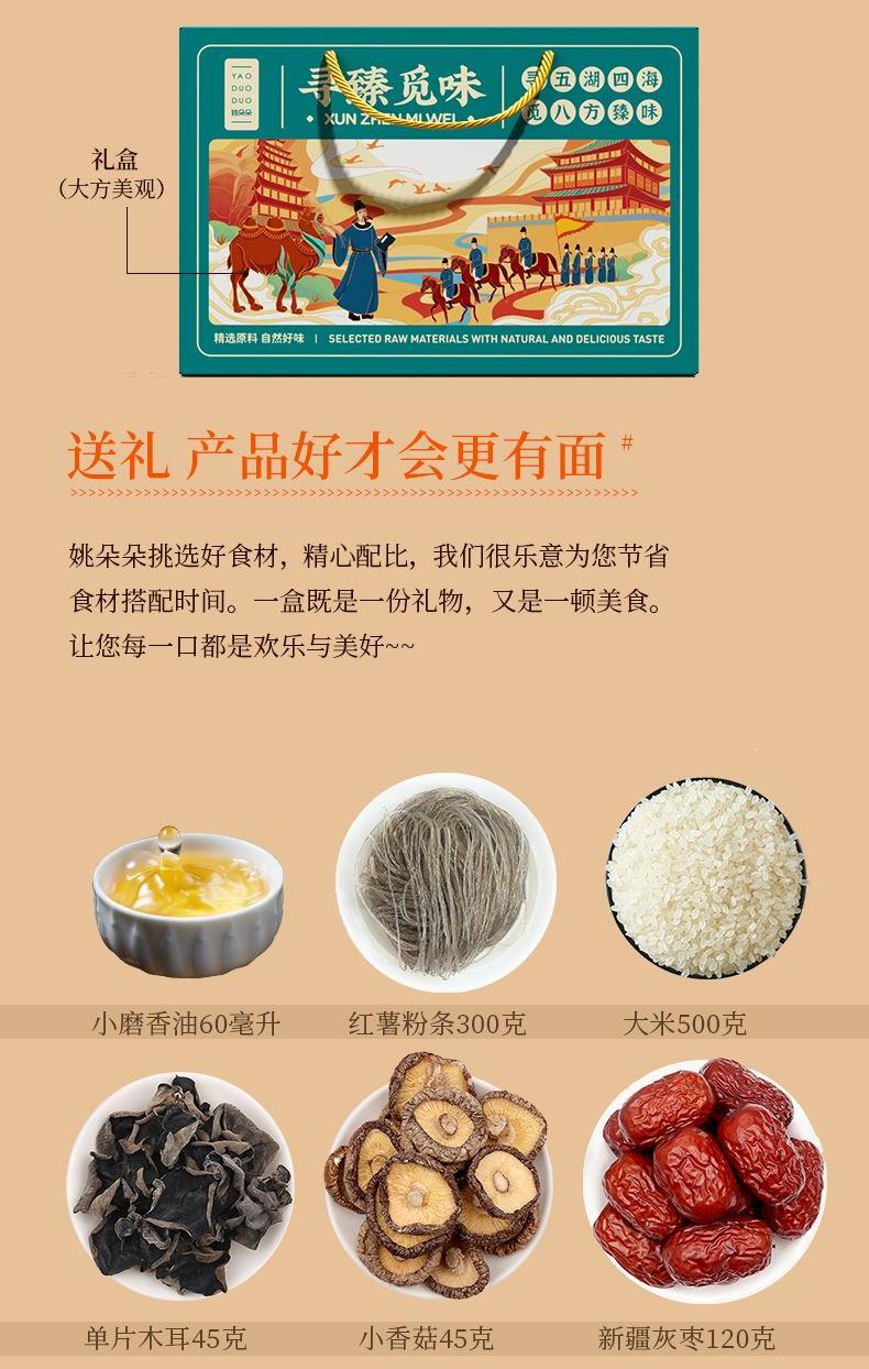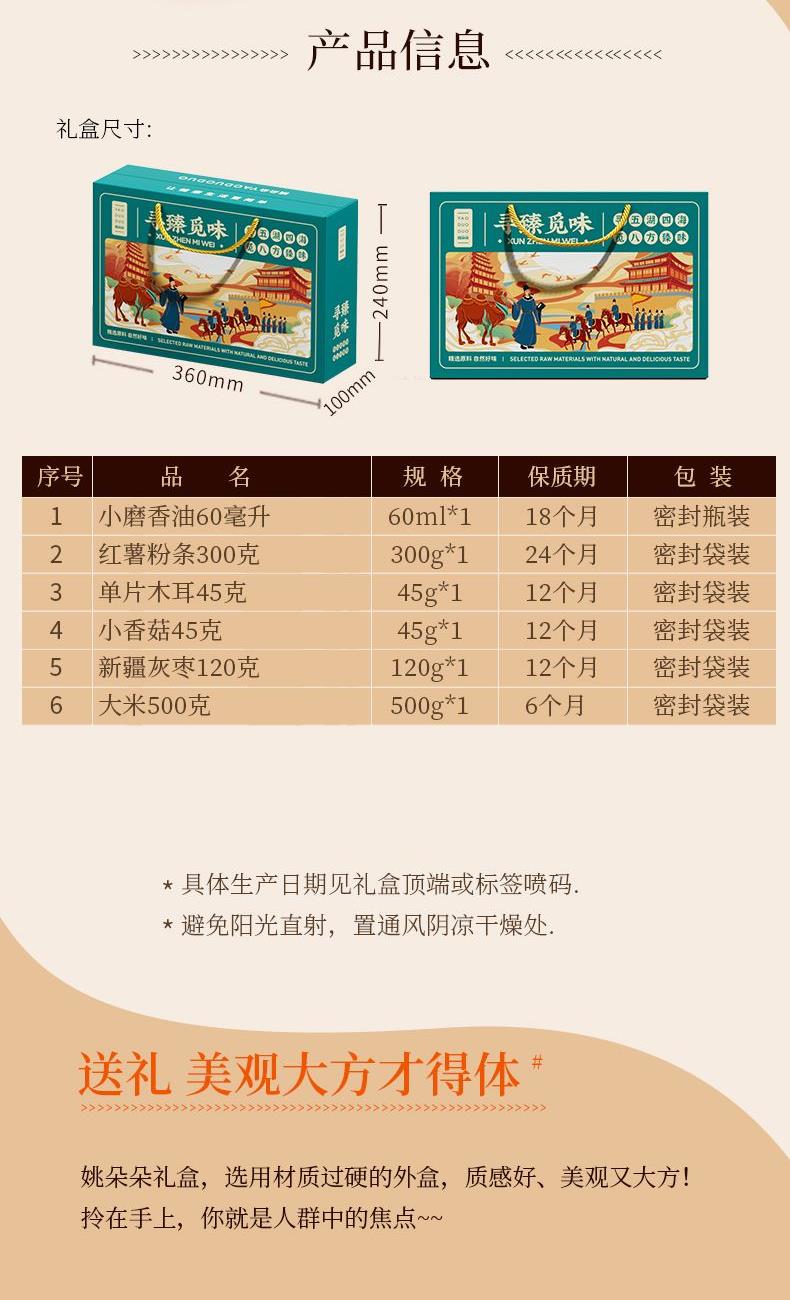 大米500克(真空贴标) 单片木耳45克 红薯粉条300克 小磨香油60ml 小香菇45克 新疆灰枣120克 包装盒-寻臻觅味礼盒