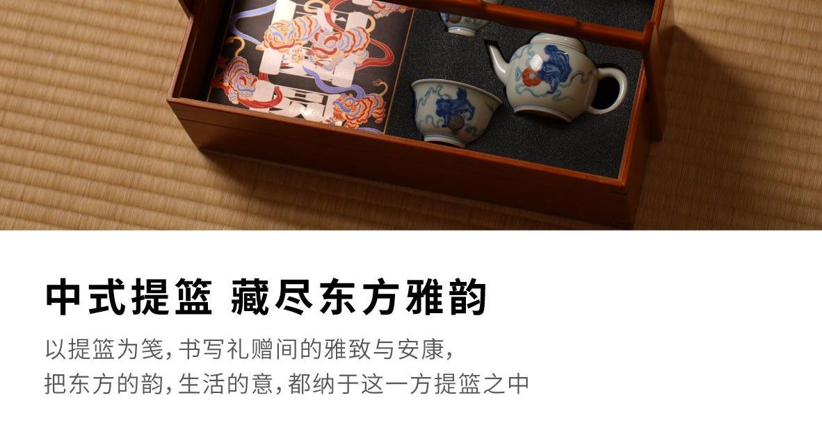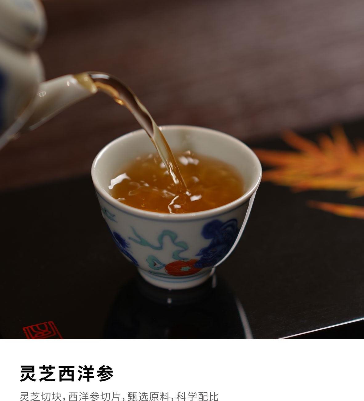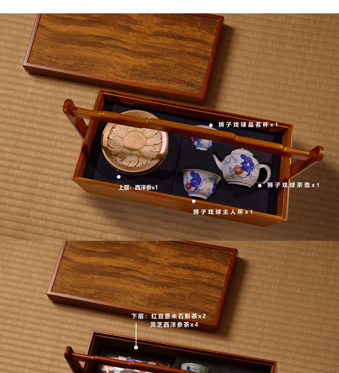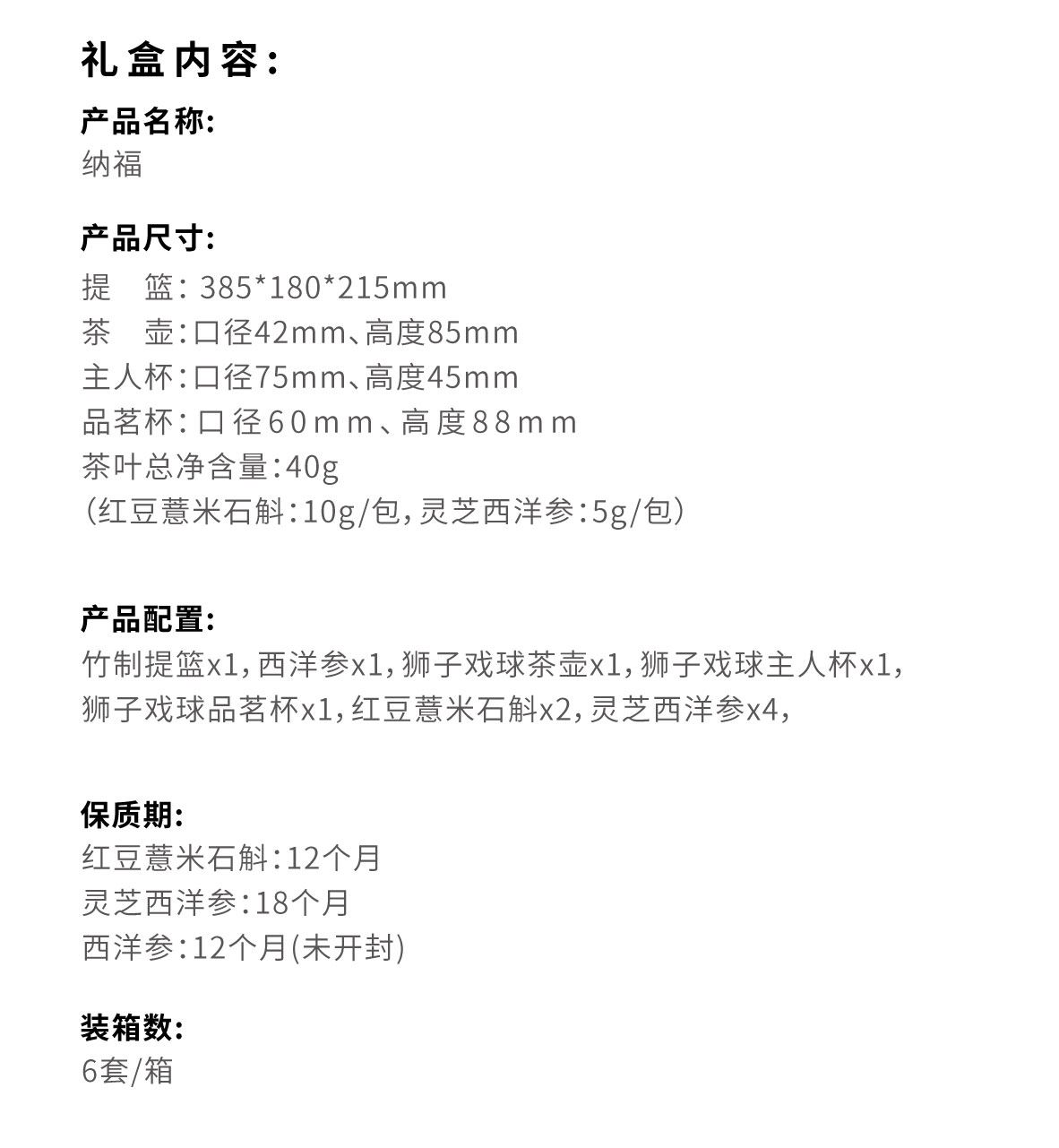 产品尺寸: 提篮: 385*180*215mm 茶壶:口径42mm、高度85mm 主人杯:口径75mm、高度45mm 品茗杯:口径60mm、高度88mm 茶叶总净含量:40g (红豆薏米石斛:10g/包,灵芝西洋参:5g/包) 产品配置: 竹制提篮x1,狮子戏球茶壶x1,狮子戏球主人杯x1, 狮子戏球品茗杯x1,红豆薏米石斛茶x2, 灵芝西洋参茶x4,西洋参x1