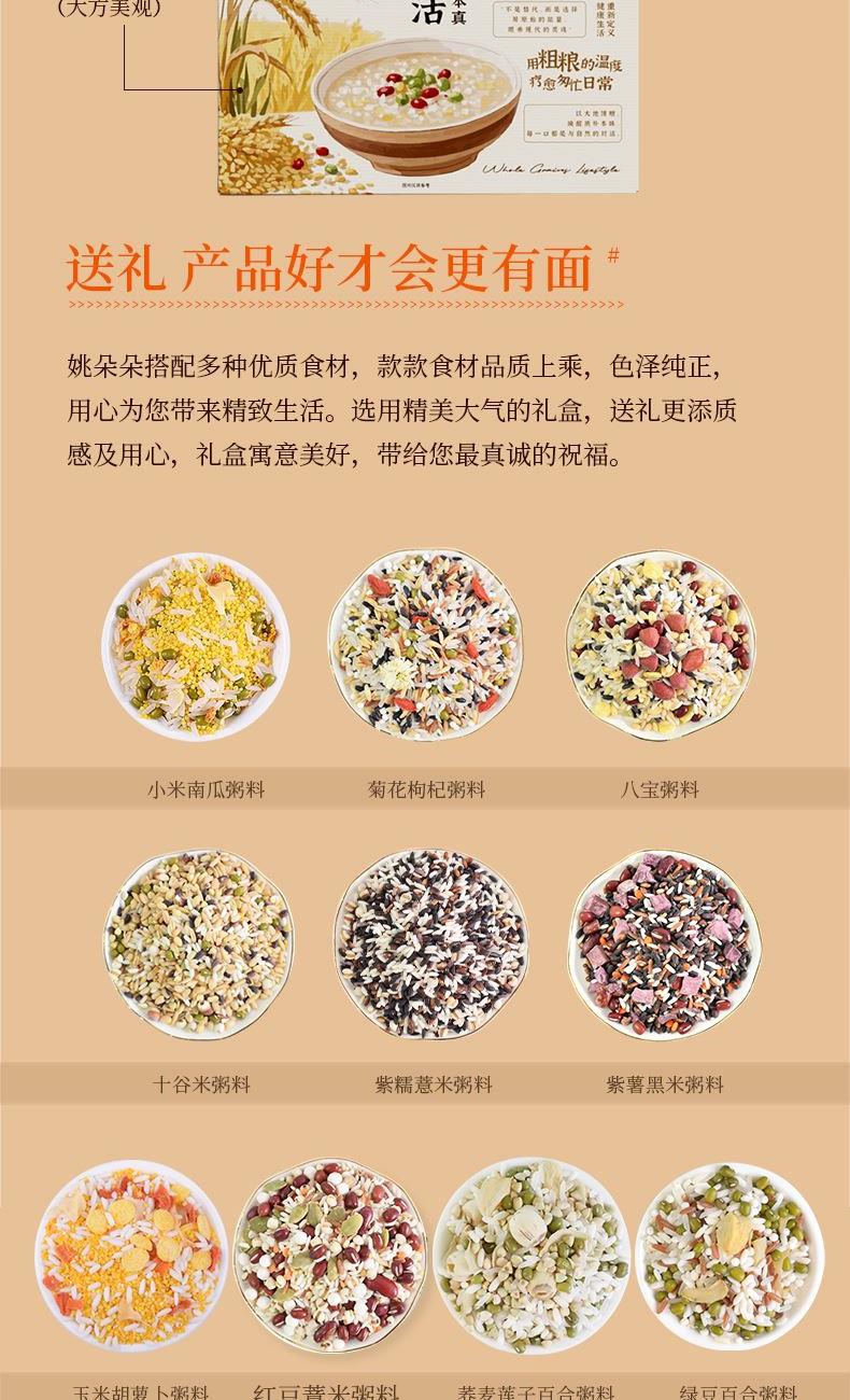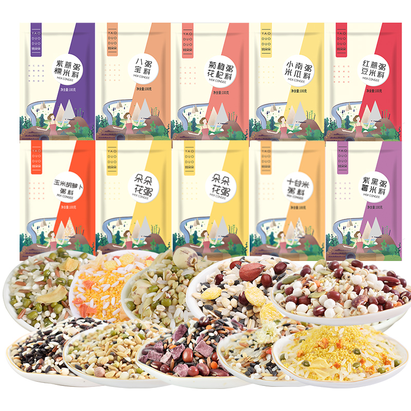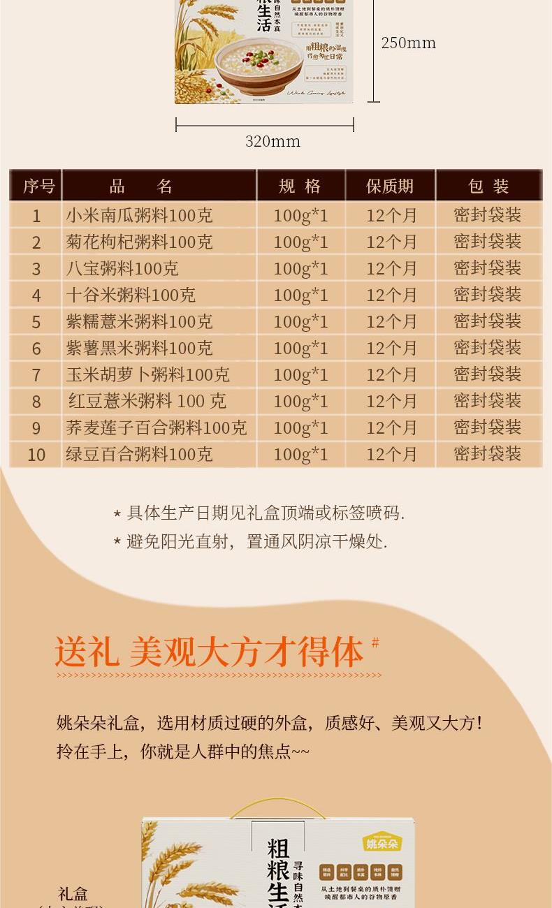 小米南瓜粥料100克 菊花枸杞粥料100克 八宝粥料100克 十谷米粥料100克 紫糯薏米粥料100克 紫薯黑米粥料100克 玉米胡萝卜粥料100克 红豆薏米粥料100克 荞麦莲子百合粥料100克 绿豆百合粥料100克 粗粮生活礼盒-定制款
