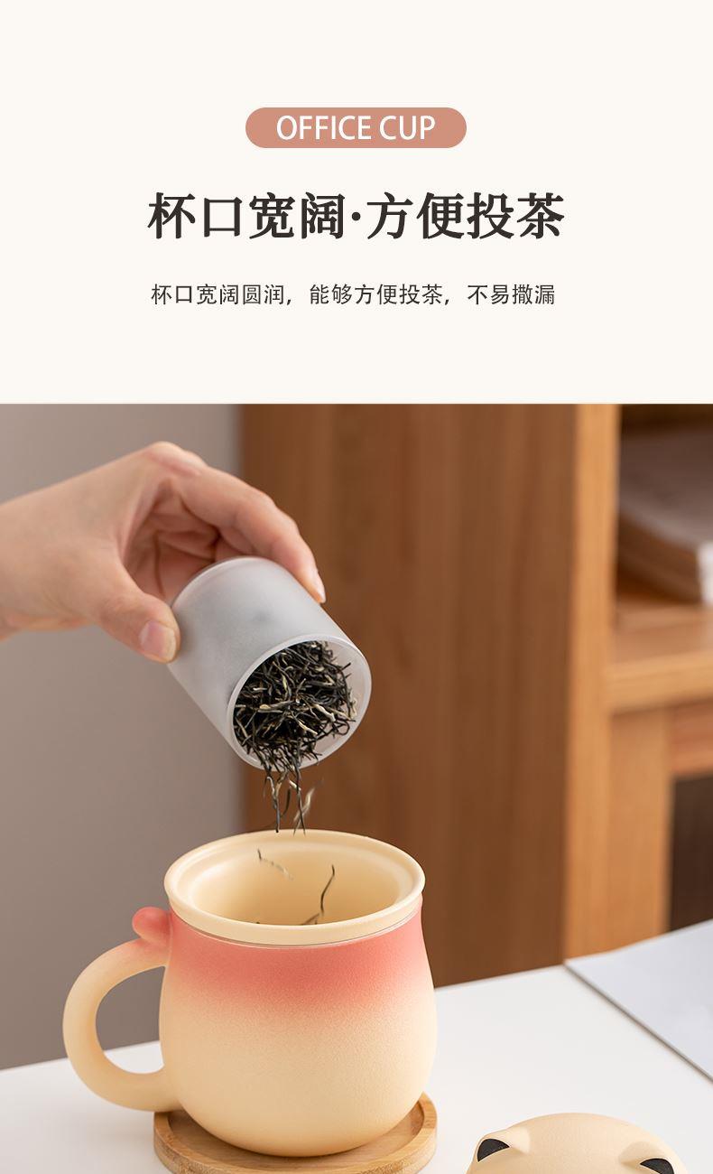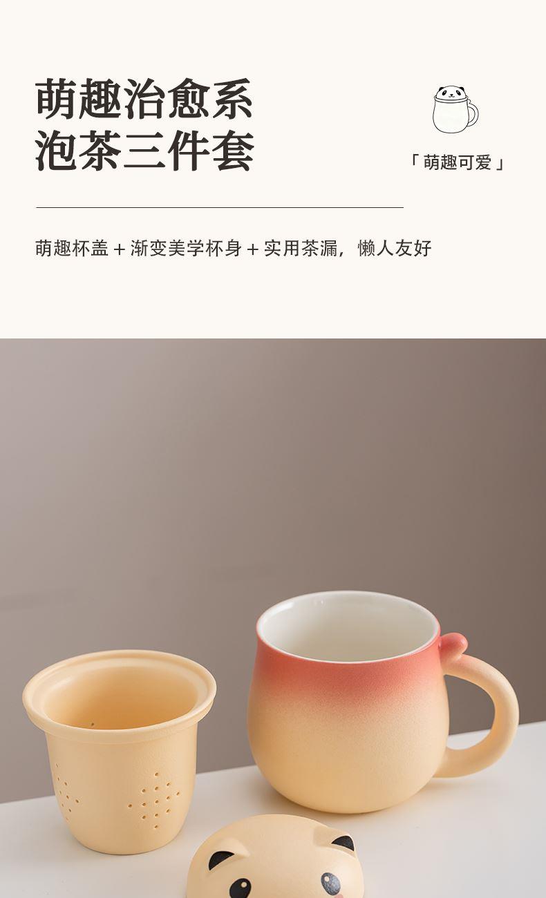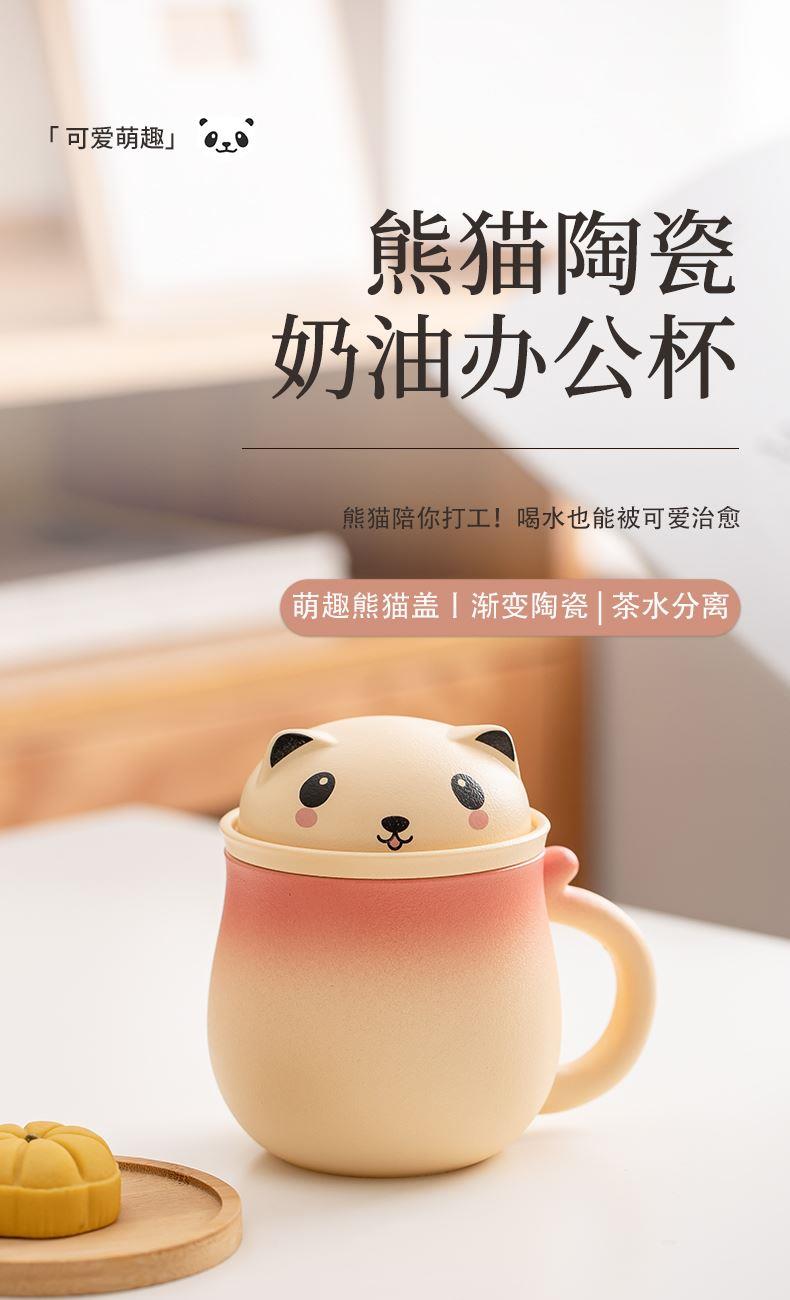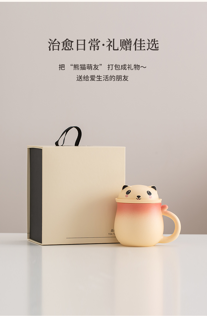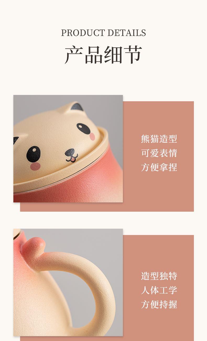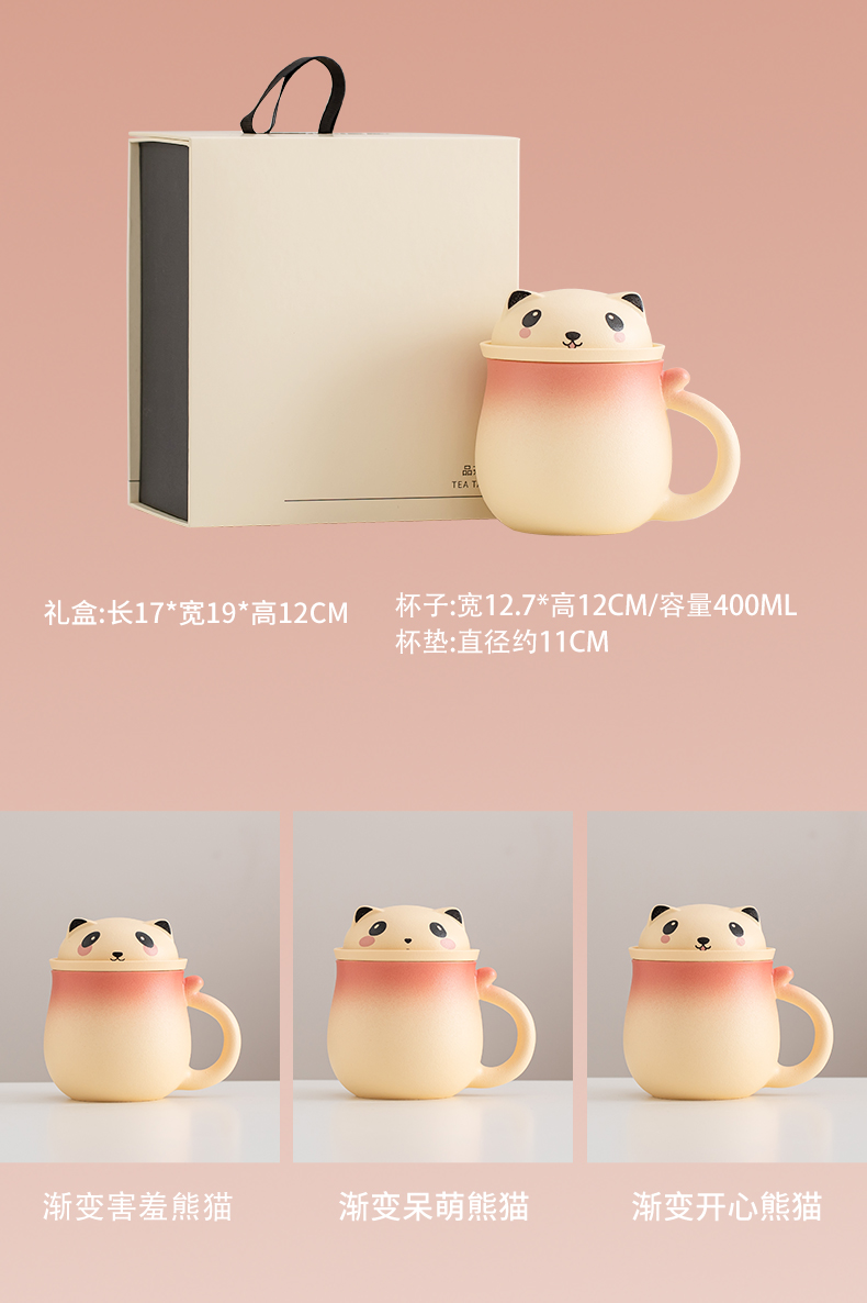 配置:办公杯*1,杯垫*1, 尺寸:杯子:宽12.7*高12CM/容量400ML, 杯垫:直径约11CM, 款式:害羞熊猫/呆萌熊猫/开心熊猫, 礼盒:长17*宽19*高12CM。