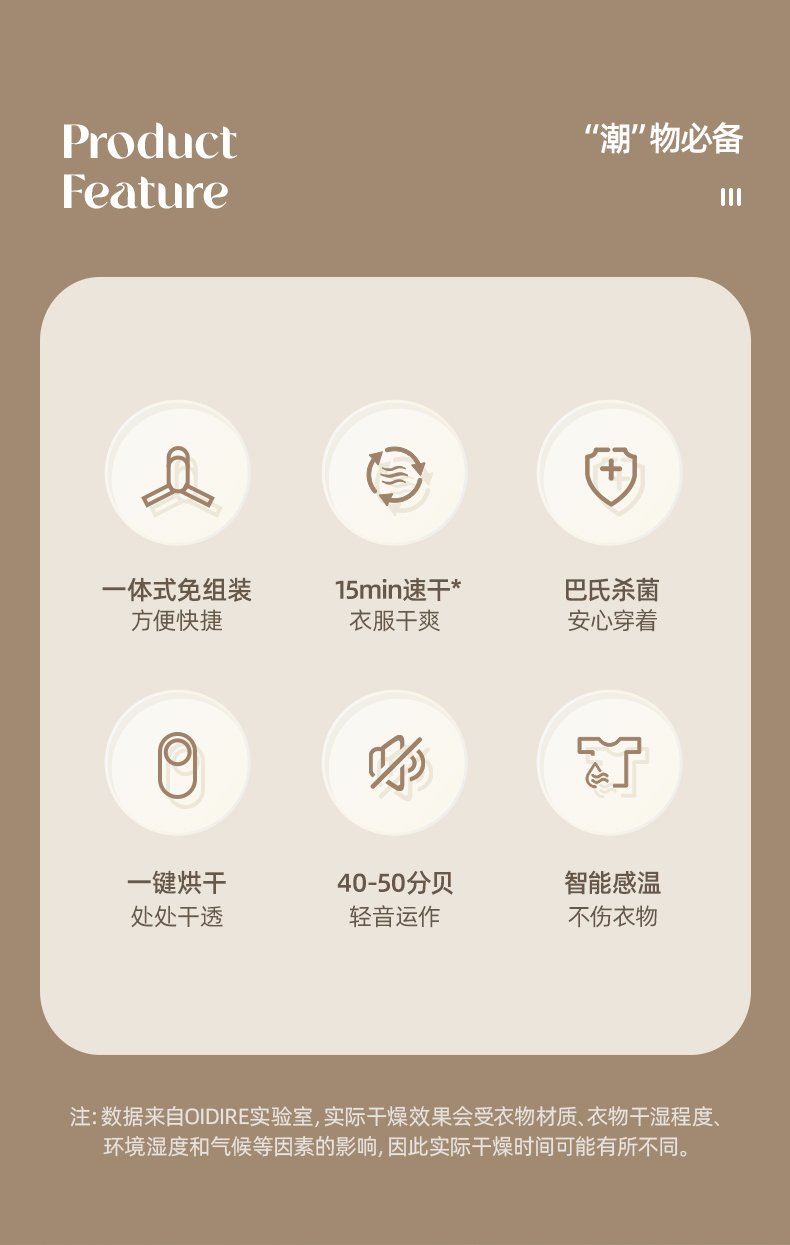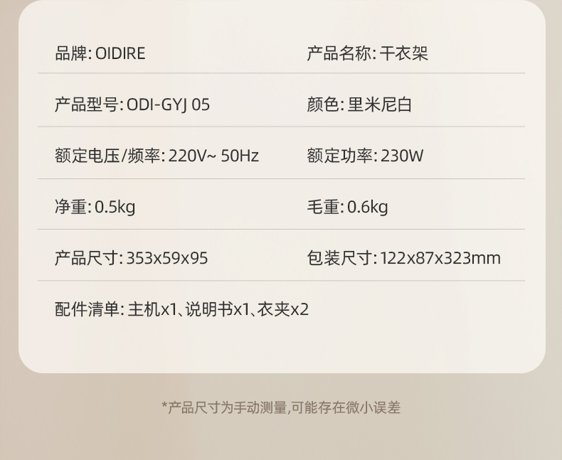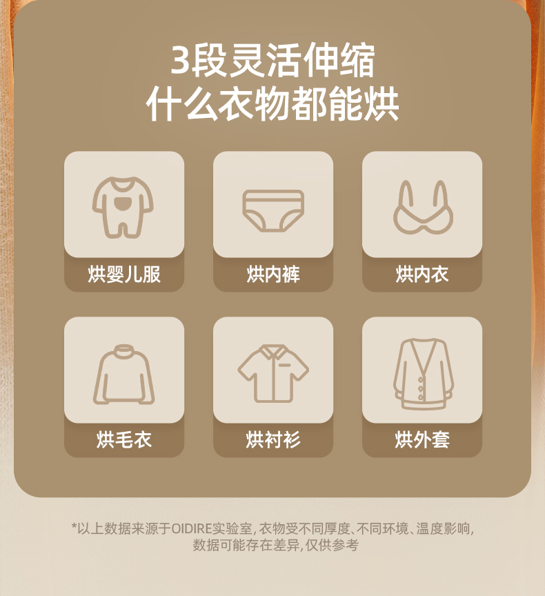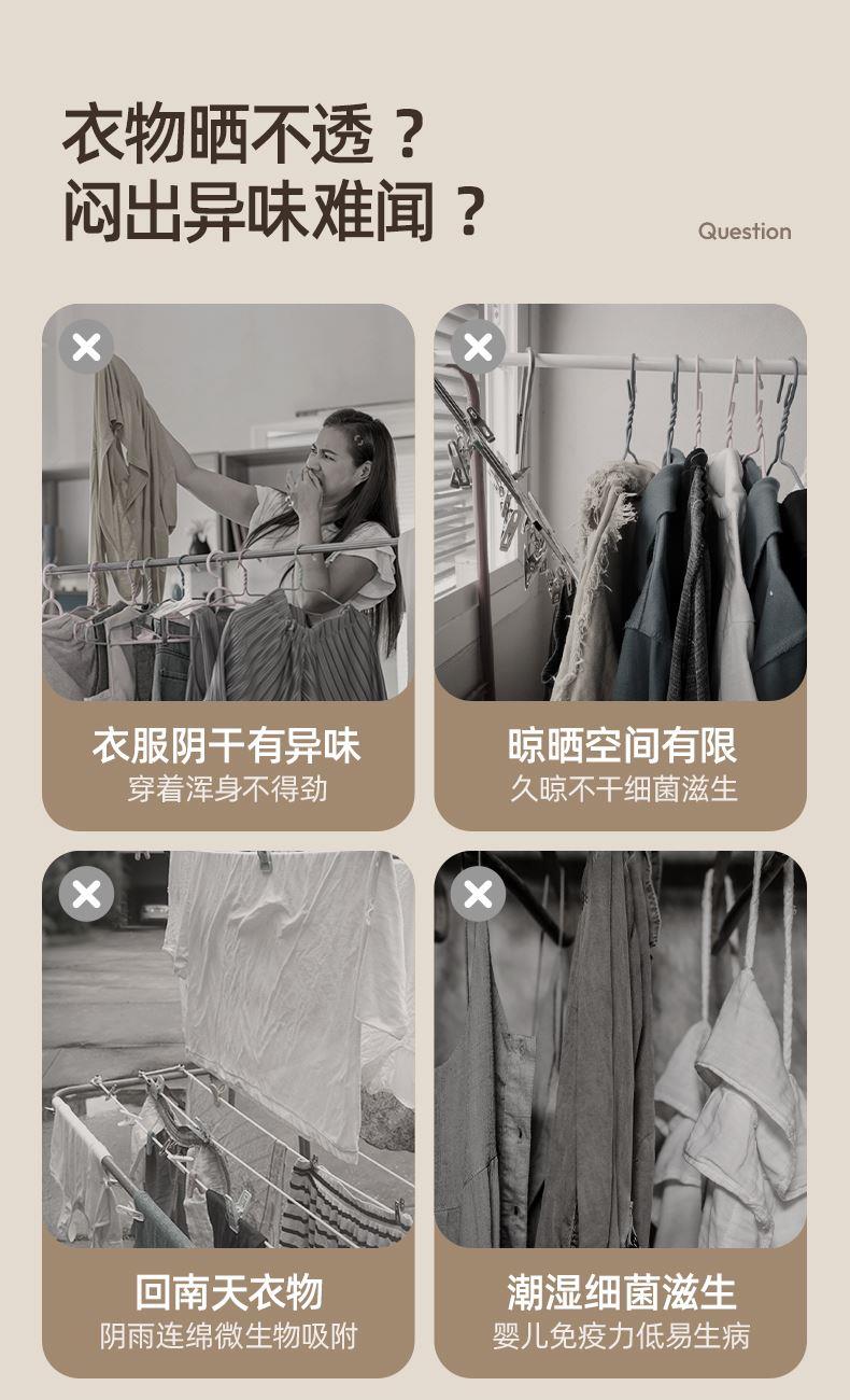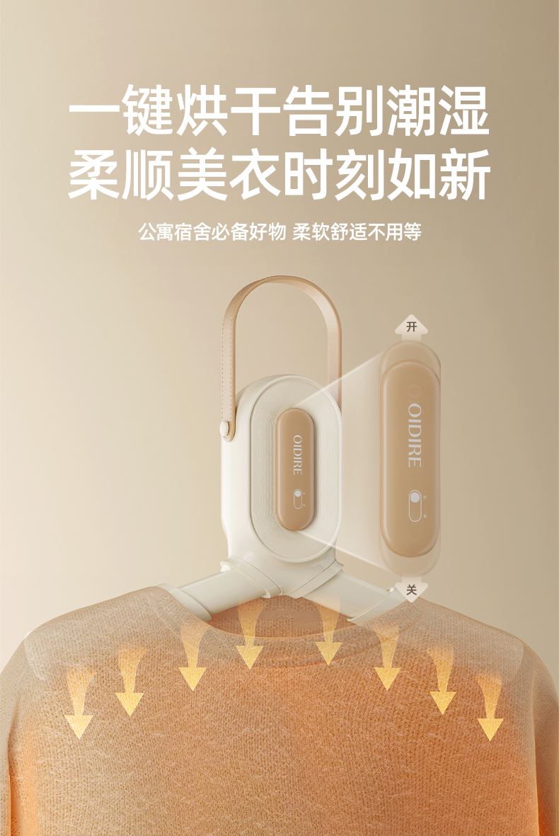主要材质:ABS 电压:220V 功率:230W 1、2段伸缩,满足不同类型衣物烘干 2、小巧便携,适合外出游玩、出差使用 3、60-80℃烘干温度,快速烘干衣服 4、一键操作,操作方便快捷 5、360°旋转风格,能烘衣服,也能烘鞋