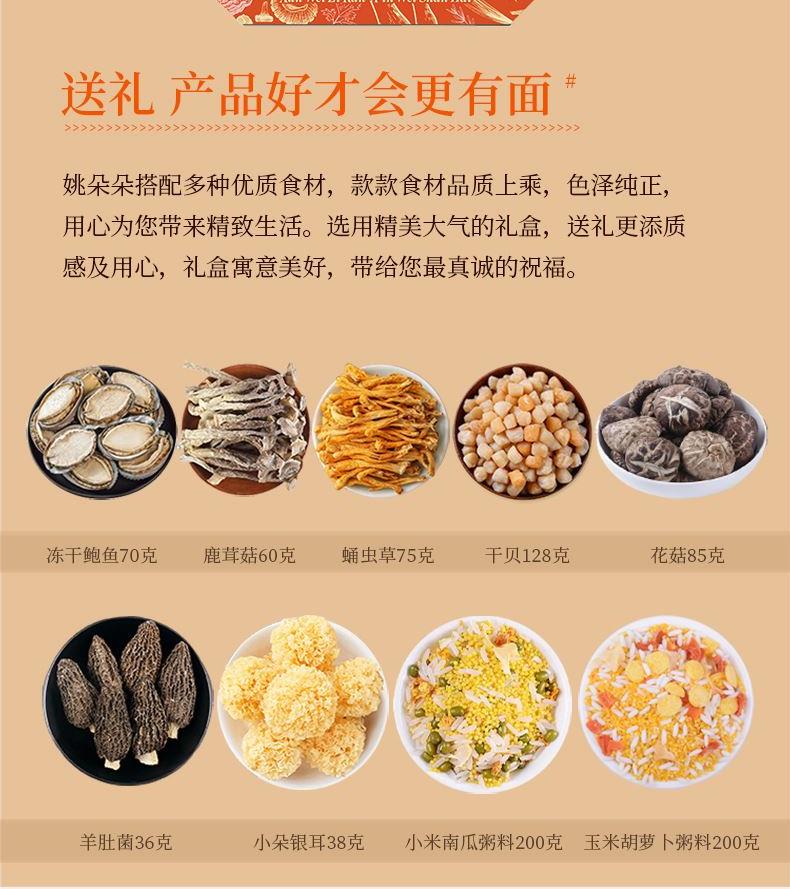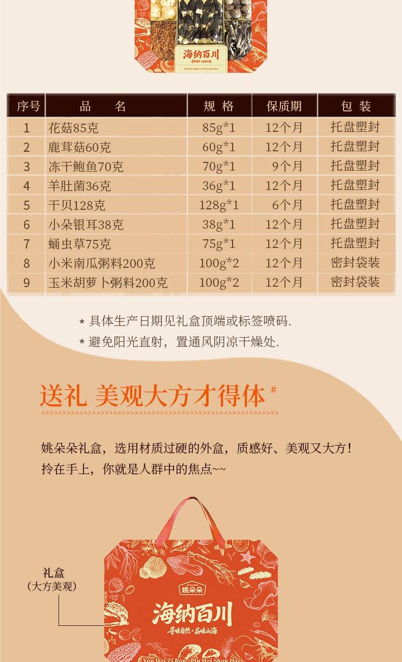 花菇85克 鹿茸菇60克 冻干鲍鱼70克 羊肚菌36克 干贝128克 小朵银耳38克 蛹虫草75克 小米南瓜粥料100克*2袋 玉米胡萝卜粥料100克*2袋 海纳百川礼盒