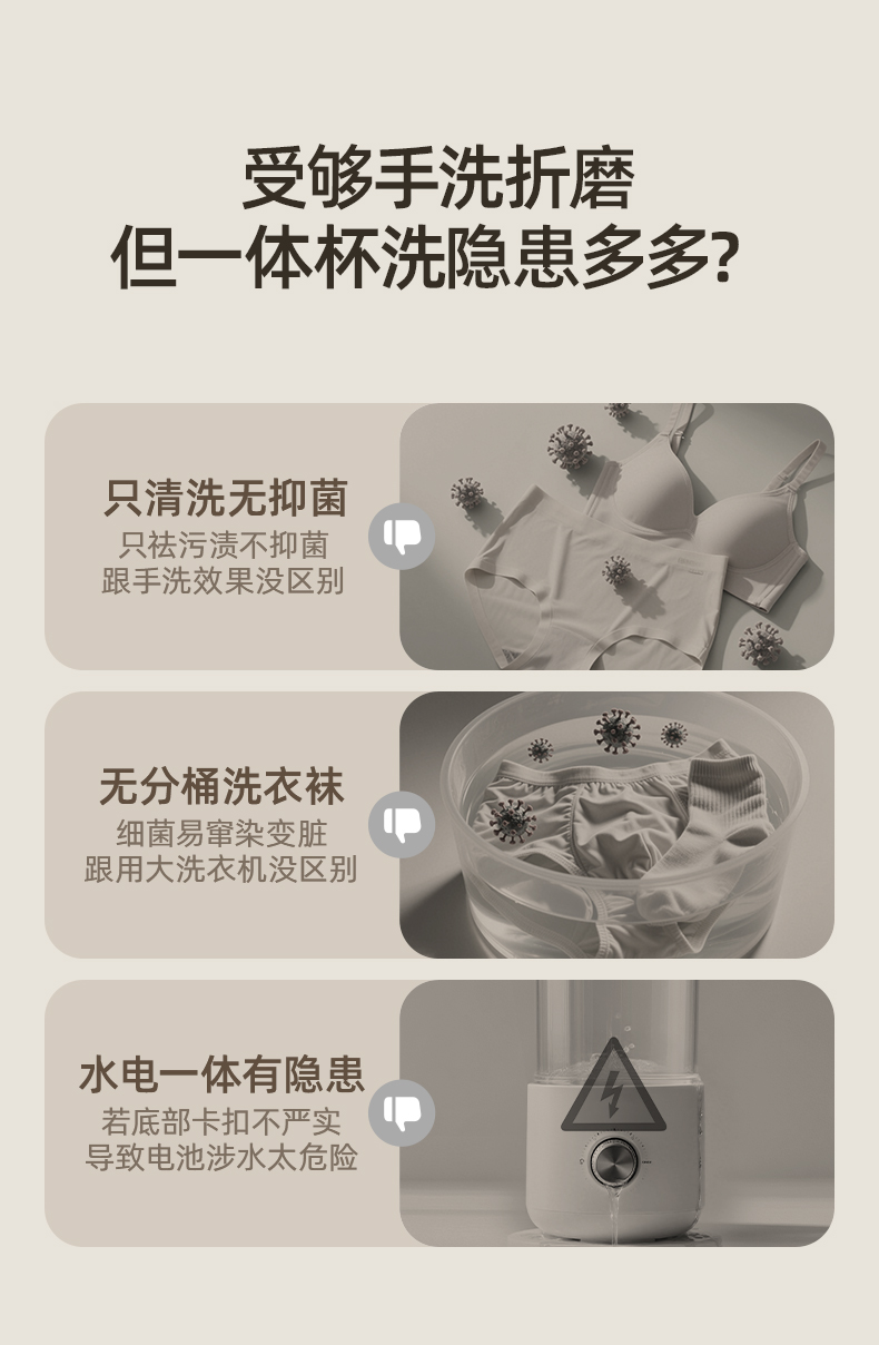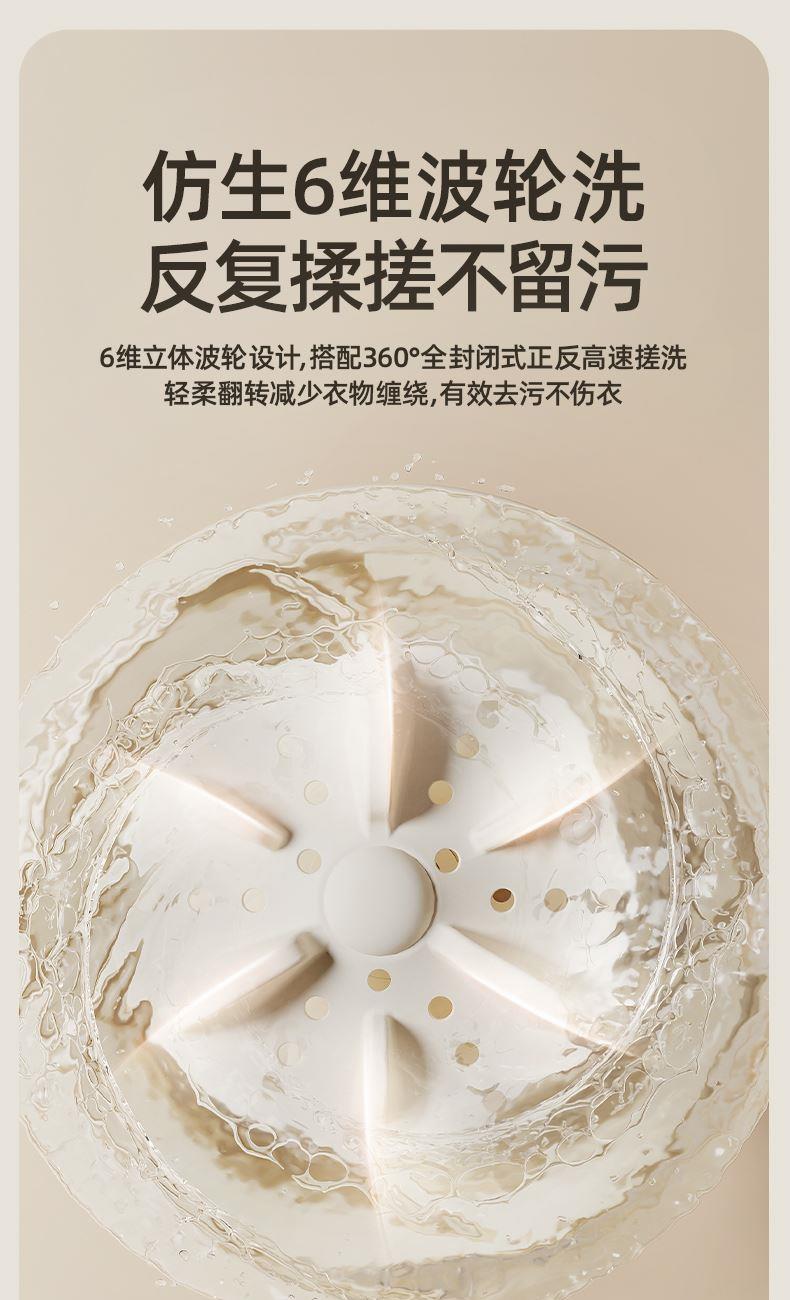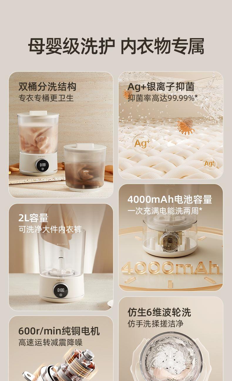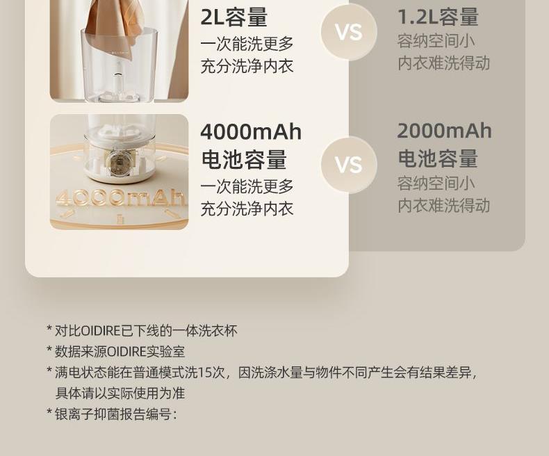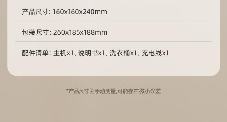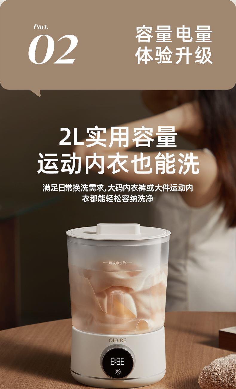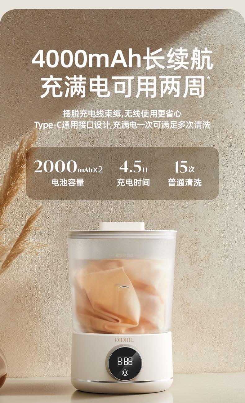 主要材质:ABS+PC 电压:7.4V 功率:25W 洗涤容量:2L 电池容量:4000mAh 1.双模式清洗,满足贴身衣物清洗需求 2.携带方便,家居旅行两不误 3.6维涡轮旋转,高效去除衣物污渍 4.换桶设计,洗衣桶能直拆,清洗方便 5.4扰流柱设计 6.满电状态约可使用15次 7.一键启动,操作简单易懂