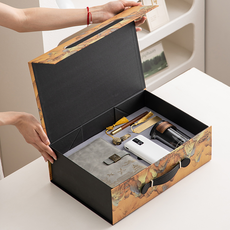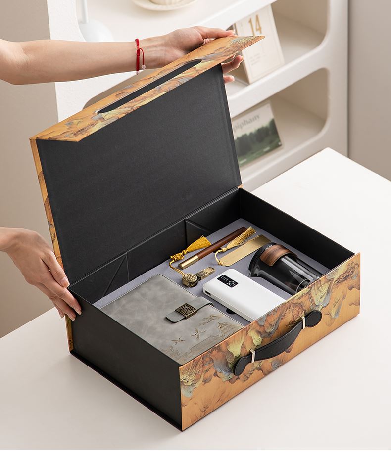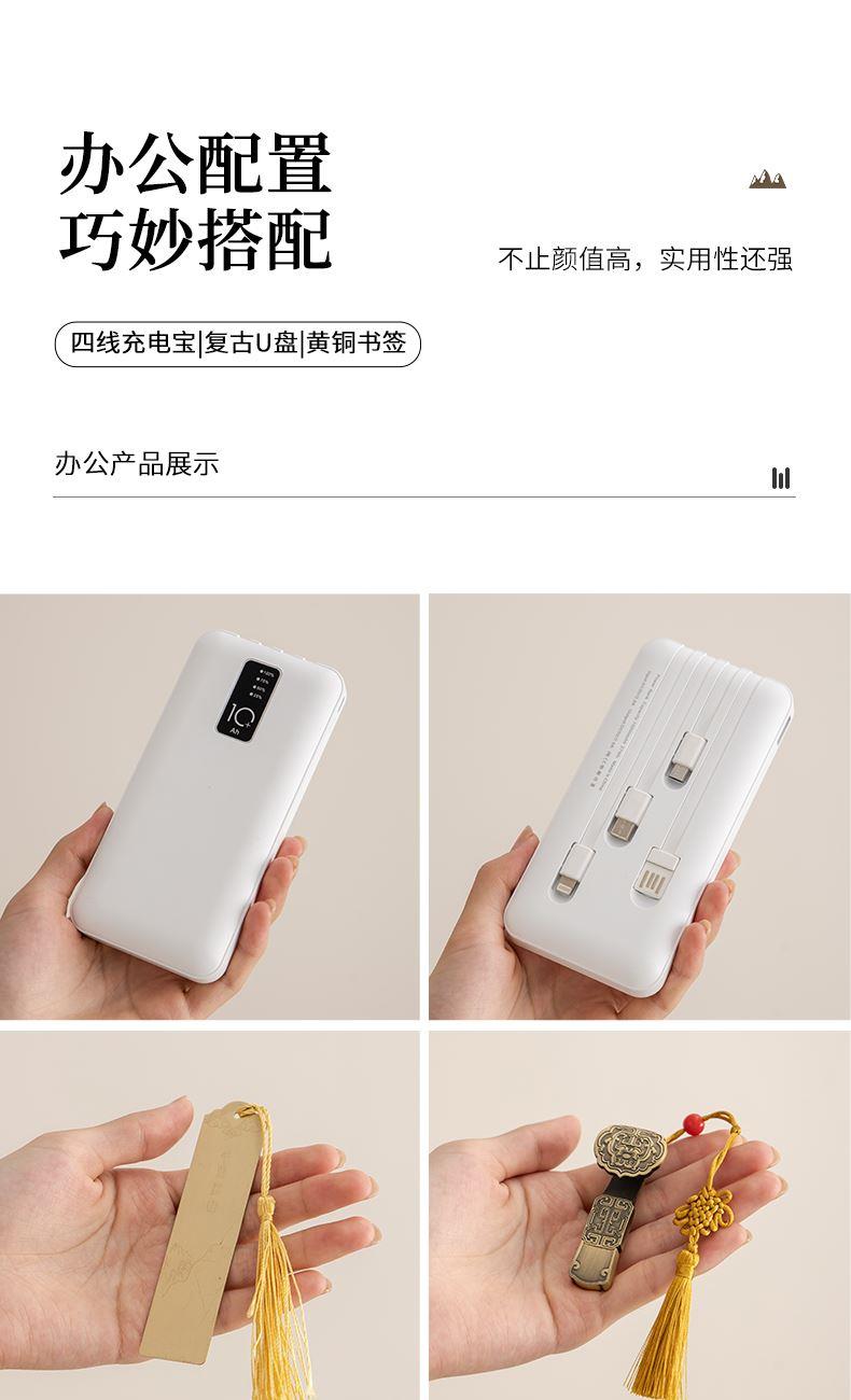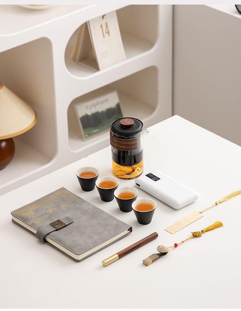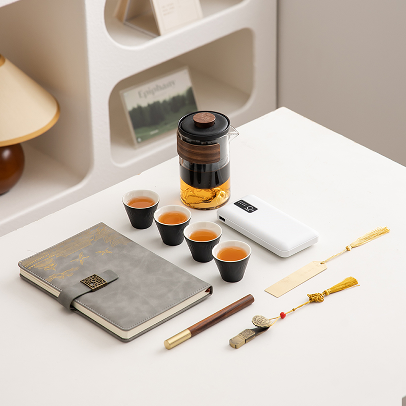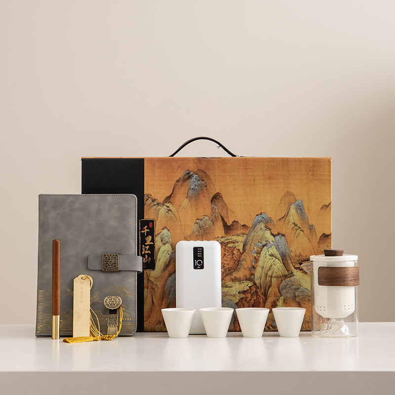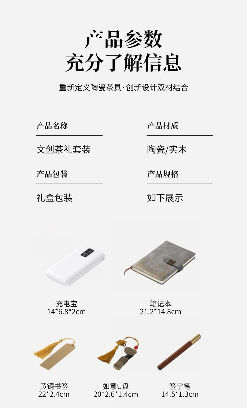 配置:茶壶*1,茶杯*4,笔记本*1,充电宝*1,书签*1,U盘*1,签字笔*1. 尺寸:茶壶8*12.7cm 容量270ml, 茶杯5*4cm 容量30ml, 笔记本21.2*14.8cm, 充电宝14*6.8*2cm, 黄铜书签22*2.4cm, 如意U盘20*2.6*1.4cm, 签字笔14.5*1.3cm。 礼盒38*12.5*26.5cm。
