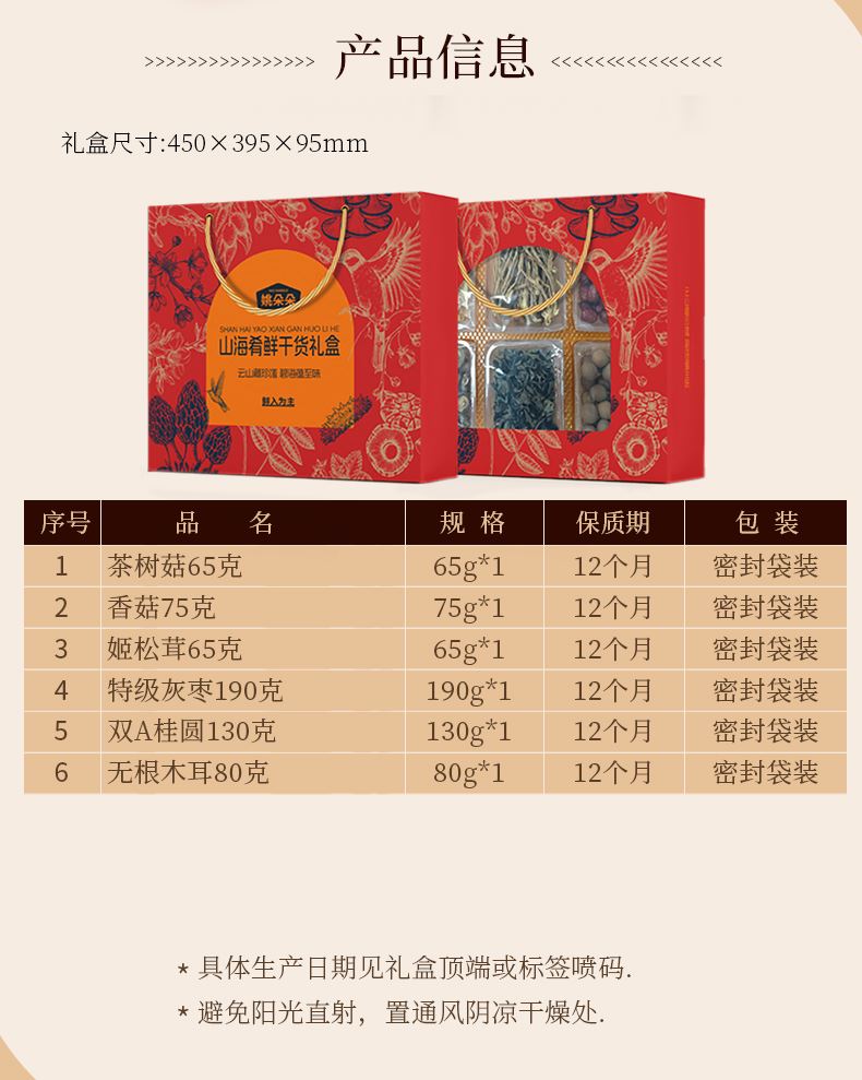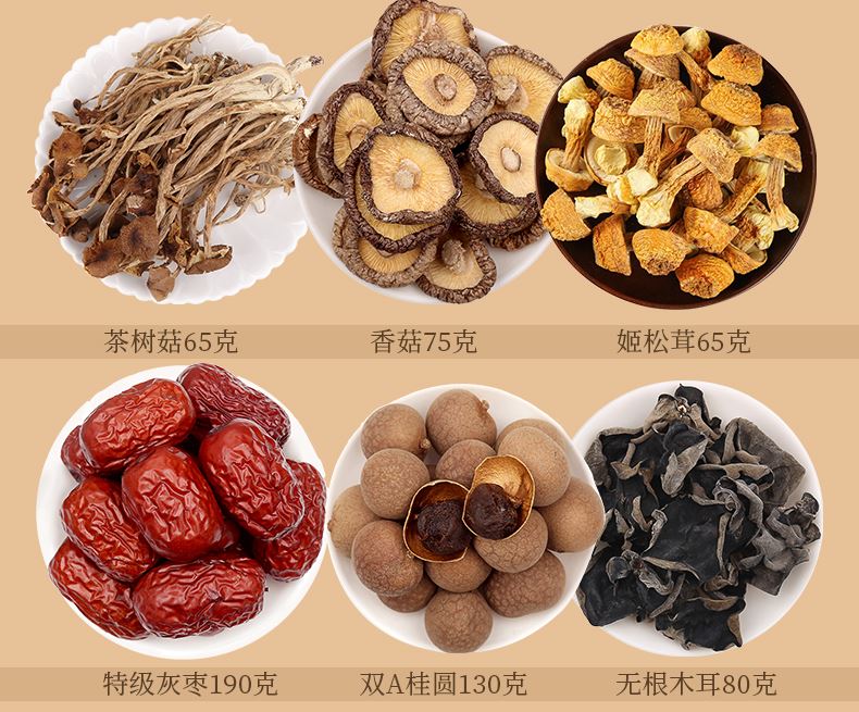 香菇75克 茶树菇65克 姬松茸65克 无根木耳80克 特级灰枣190克 双A桂圆130克