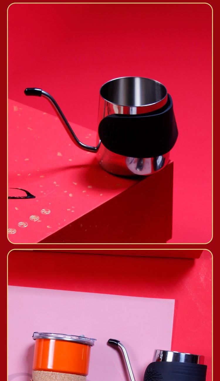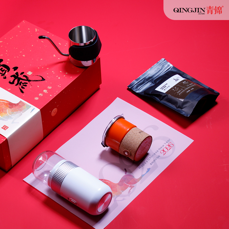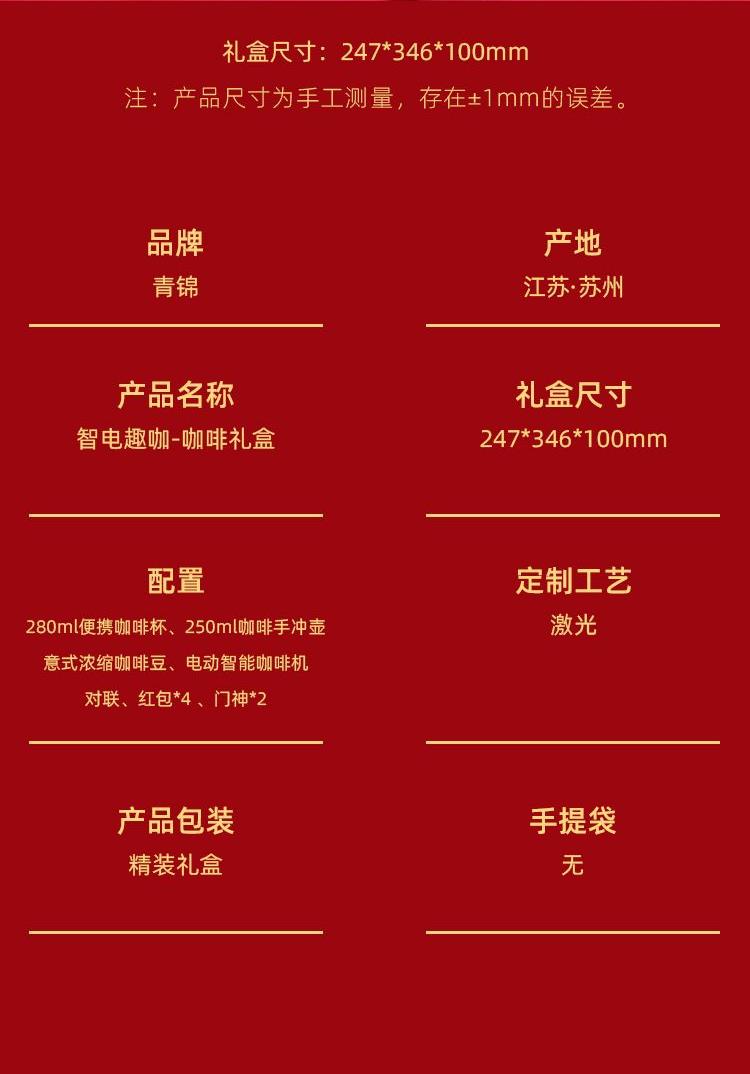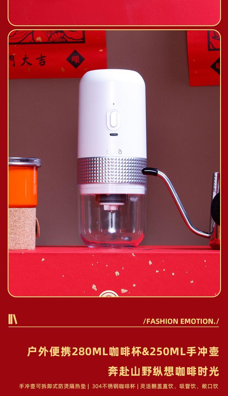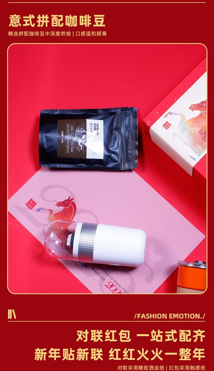 户外便携咖啡杯x1容量280ml 户外咖啡手冲壶*1容量250ml 意式浓缩咖啡豆*1包1000克 对联横批*1门神*2红包*4 电动智能咖啡机*1 精装礼盒手提袋*1