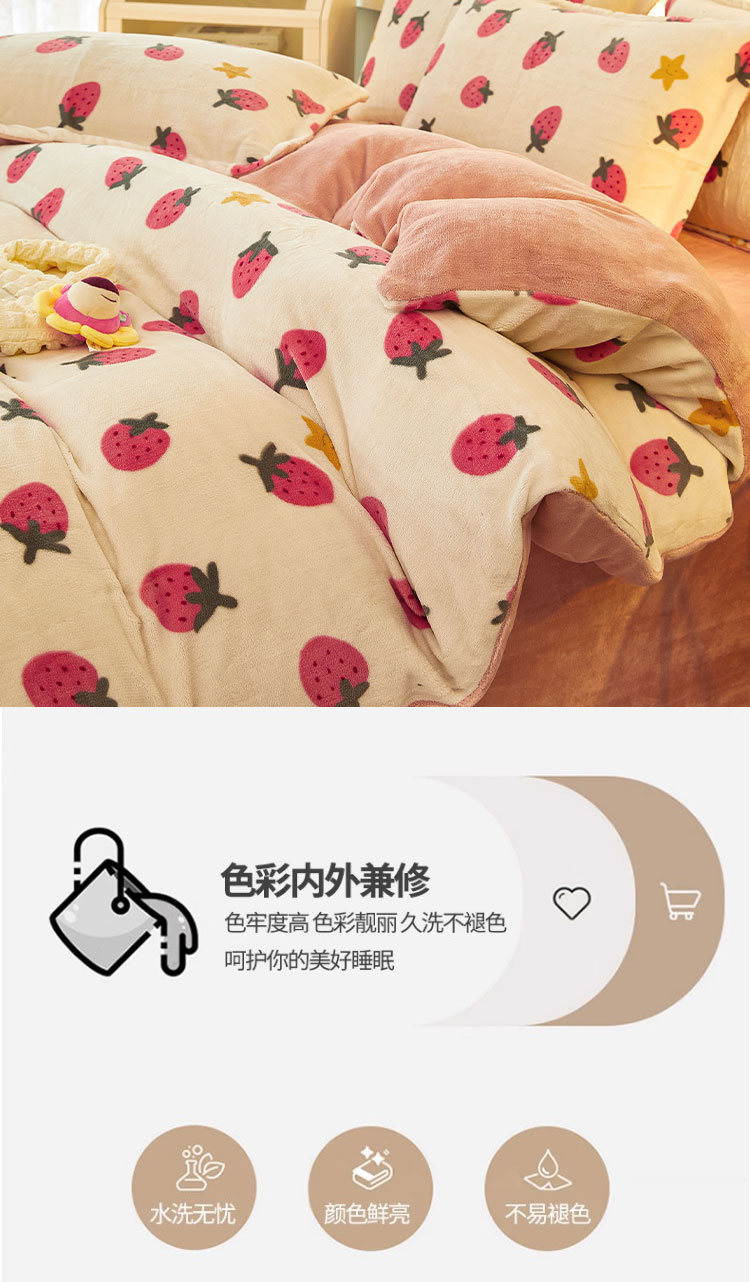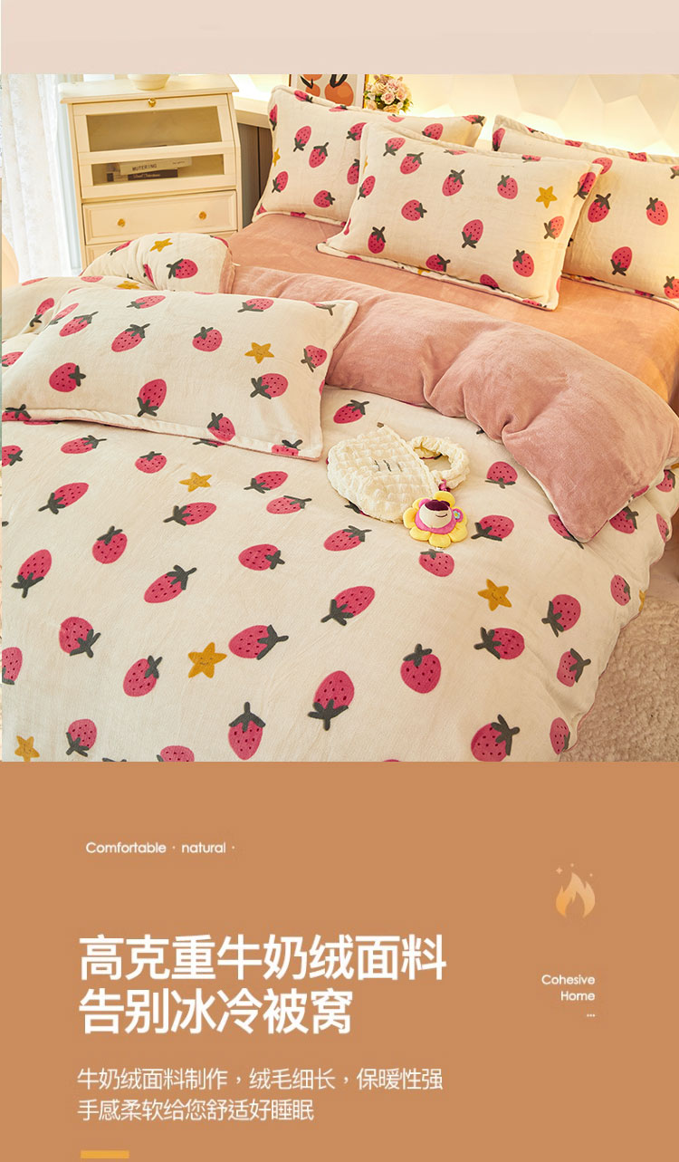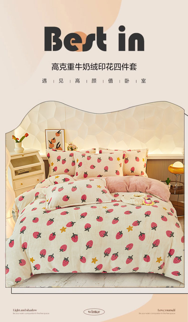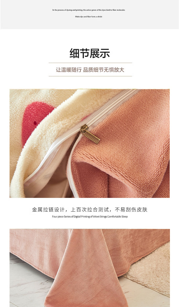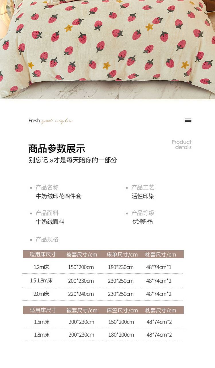 1:唤醒冬日诠释温暖睡眠 牛奶绒四件套系列 2:牛奶绒面料 表面有一层丰满细洁的绒毛覆盖,不漏织纹手感柔软平整,具有舒适的触感以及很好的保暖效果 3:活性印染工艺,色牢度高,不易褪色 绑带设计防止被芯乱跑 尺寸:被套:200*230cm*1 床单:230*250cm*1 枕套:48*74cm*2 重量:4kg(净重) 包装:礼袋/礼盒