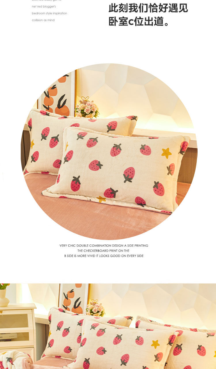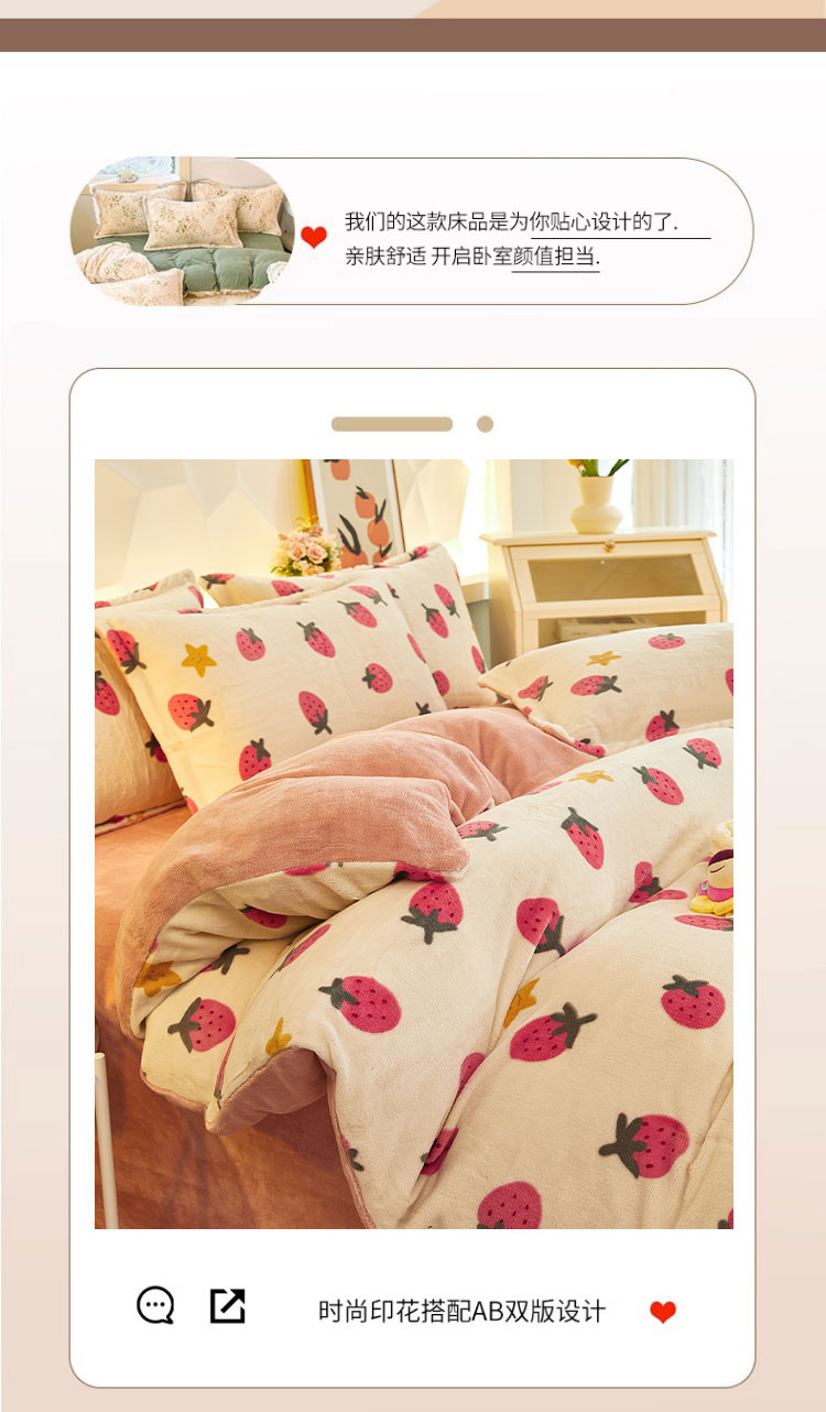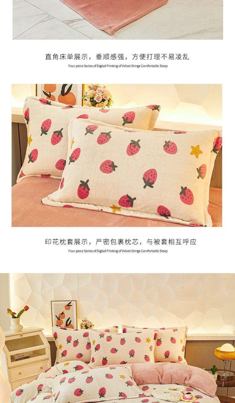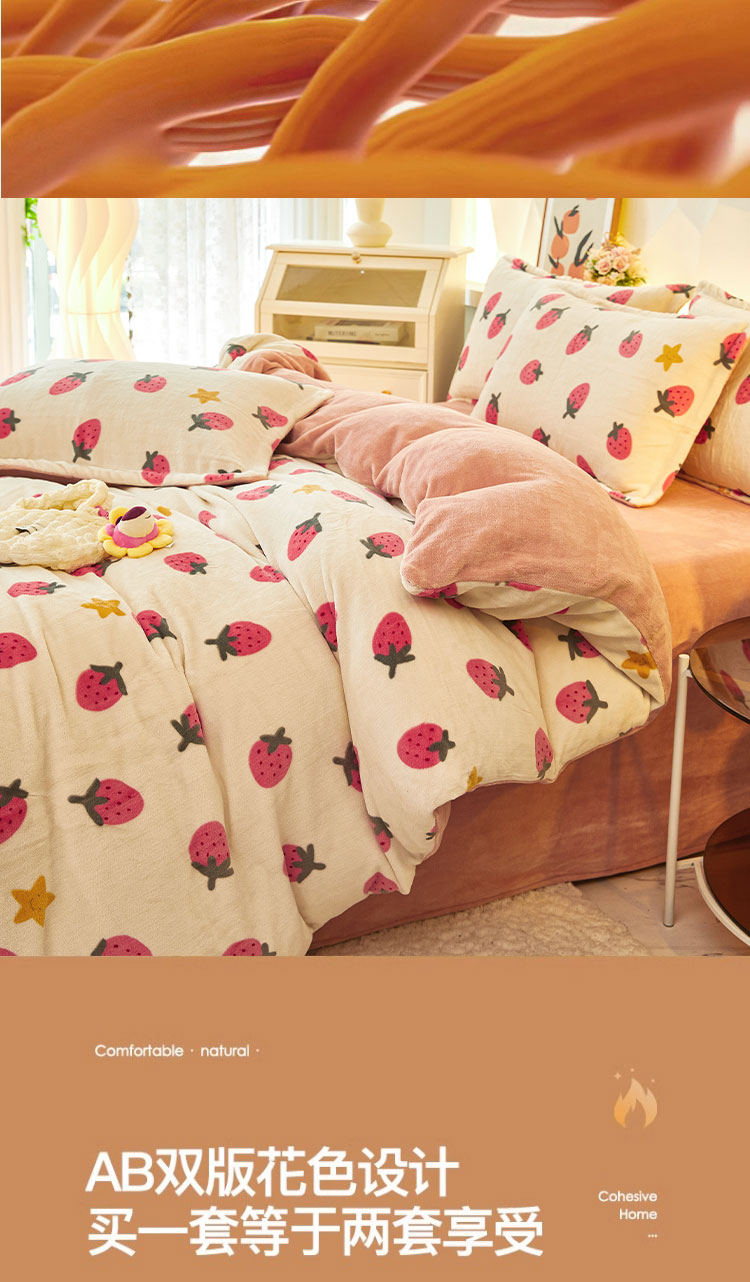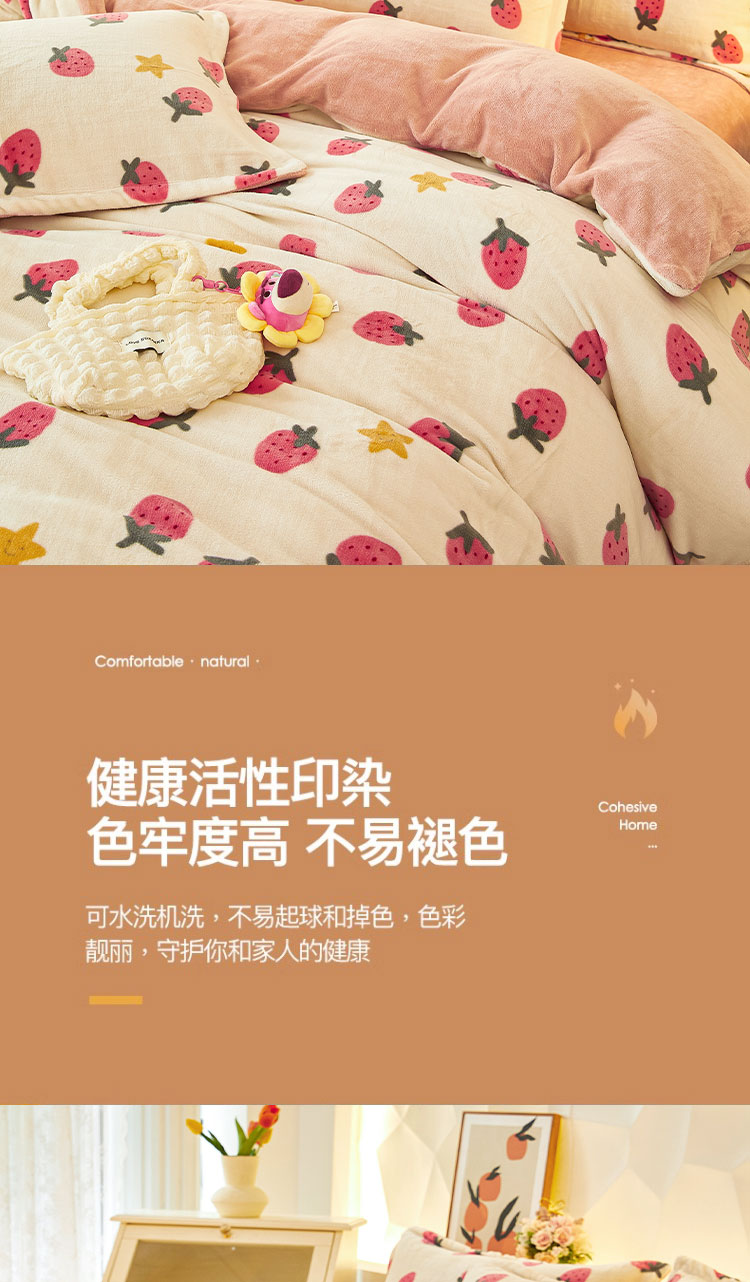1:唤醒冬日诠释温暖睡眠 牛奶绒四件套系列 2:牛奶绒面料 表面有一层丰满细洁的绒毛覆盖,不漏织纹手感柔软平整,具有舒适的触感以及很好的保暖效果 3:活性印染工艺,色牢度高,不易褪色 绑带设计防止被芯乱跑 尺寸:被套:200*230cm*1 床单:230*250cm*1 枕套:48*74cm*2 重量:4kg(净重) 包装:礼袋/礼盒