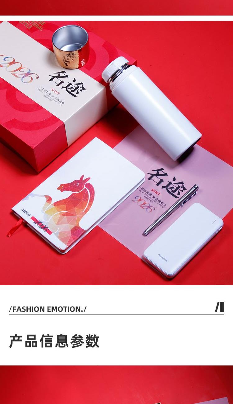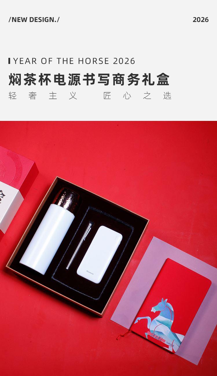 配置 焖茶杯480ML*1 白马笔记本*1 颜色黑色/红色/彩印色 签字笔*1 移动电源*1 纽曼 手提袋套*1 精装礼盒*1 材质 保温杯:304钢 签字笔:abs 笔记本:皮革千越象牙白纸100克80张 尺寸 笔记本:130*212mm 保温杯:232*69mm 礼盒:272*272*83mm