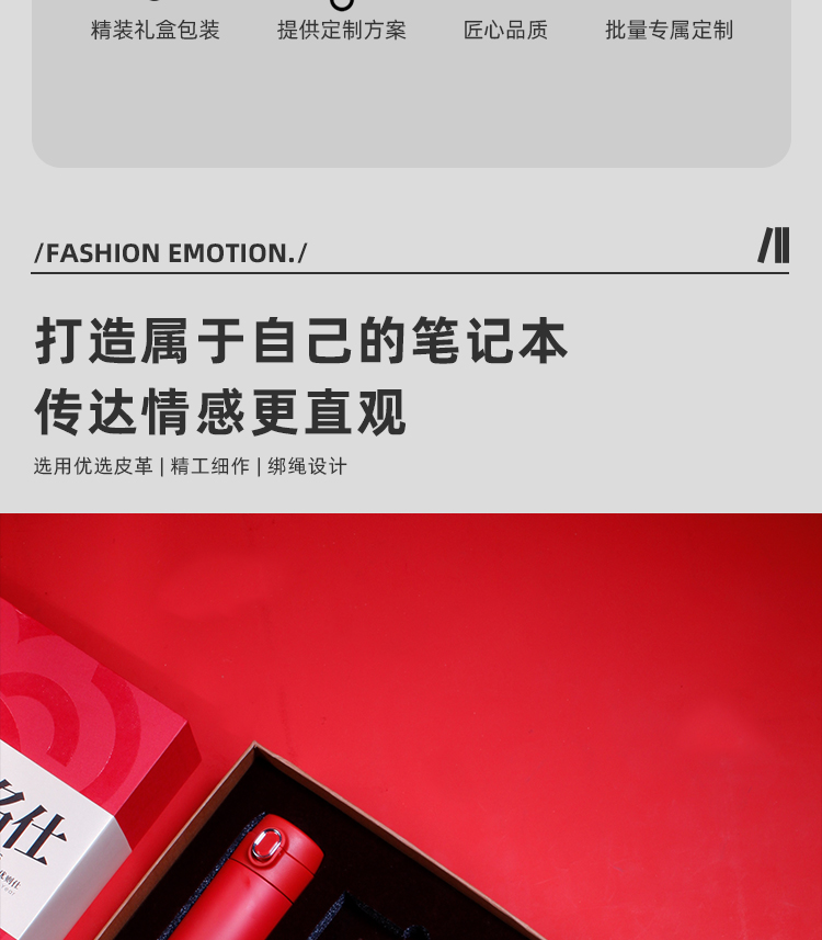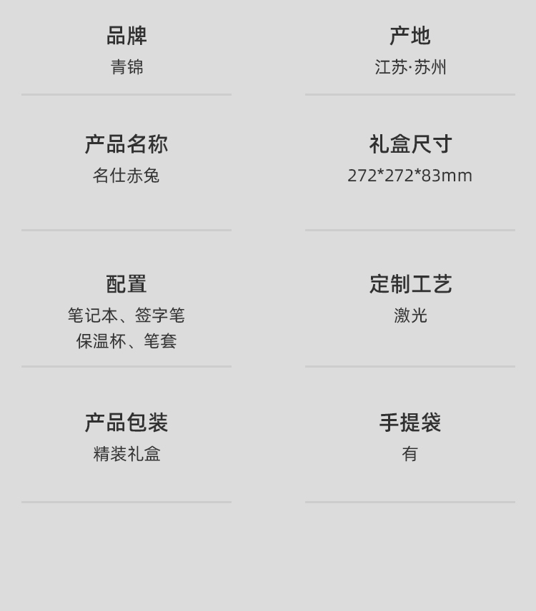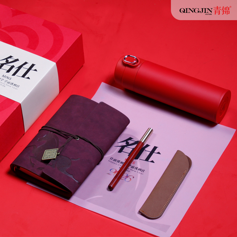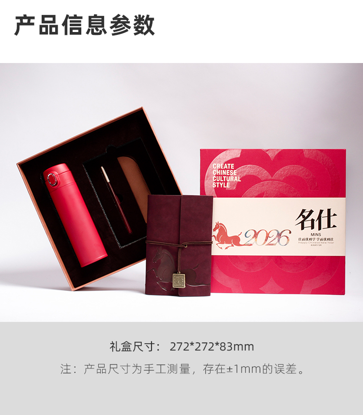 配置 名仕保温杯350ML*1 书友红木签字笔*1 汉马笔记本*1 精装礼盒*1 手提袋套*1 材质 保温杯:304钢 签字笔:金属 笔记本:皮革象牙白纸100克80张 签字笔:科檀木/黄铜 笔套:皮革 尺寸 笔记本:130*183mm 签字笔:141*10mm 笔套:140*32mm 保温杯:200*60*60mm 礼盒:272*272*83mm