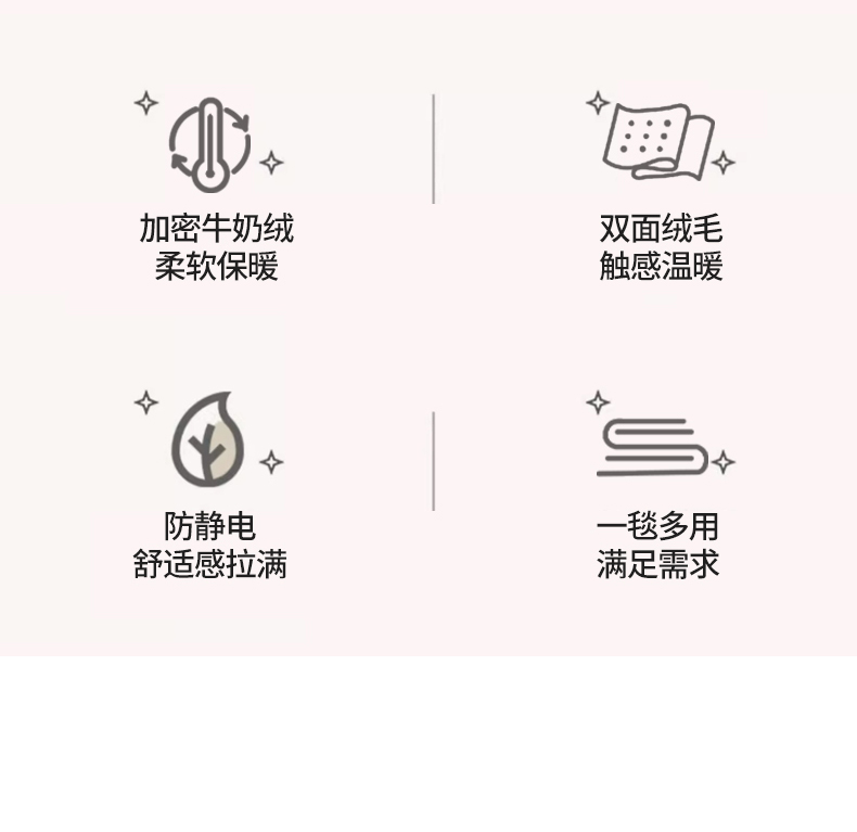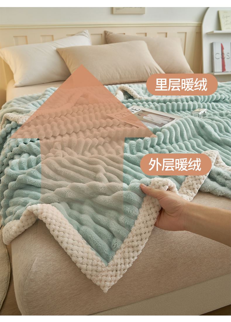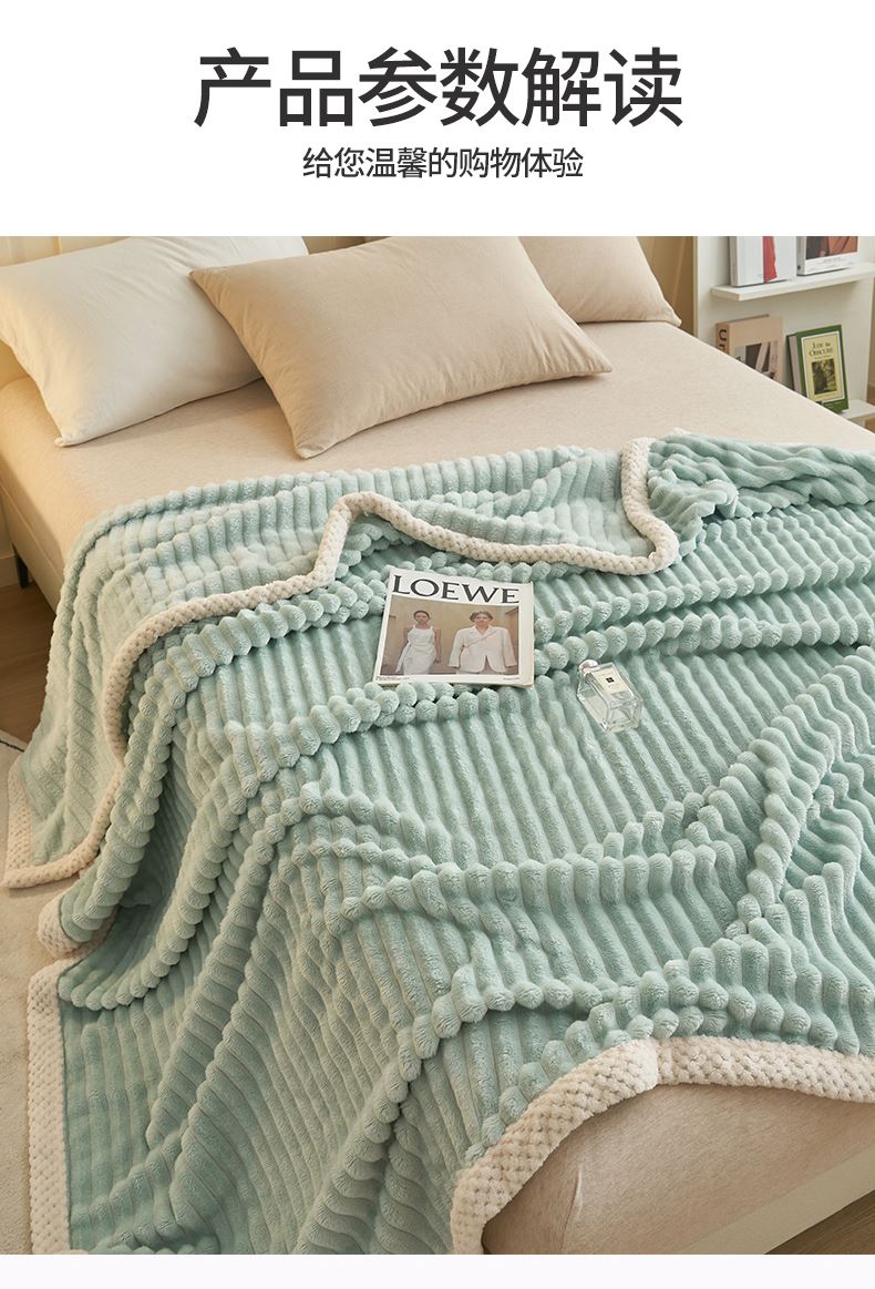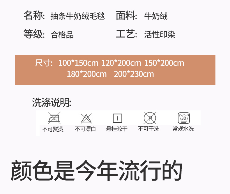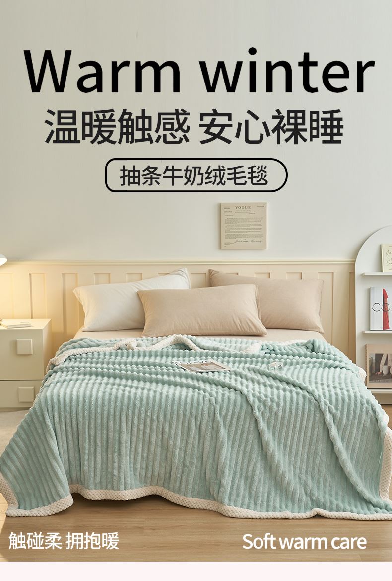 规格: 180*200cm 面料:聚酯纤维 花色:宝石蓝、豆沙色、灰、精英咖、靓女粉、咖啡色、卡其驼、抹茶绿、奶油白、深灰色 高密牛奶绒,绒毛丰盈密实,工艺厚实紧密柔软保暖,高品质印染工艺,着色安全且色牢度高,不惧多次洗涤,毛毯采用抽条工艺,美感直接拉满,点缀床品不单调带来视觉享受。