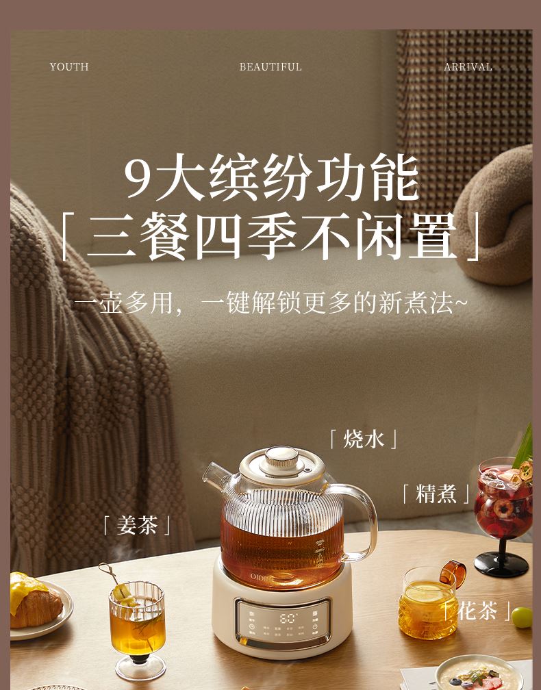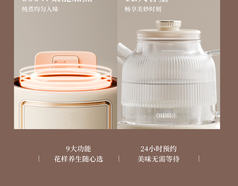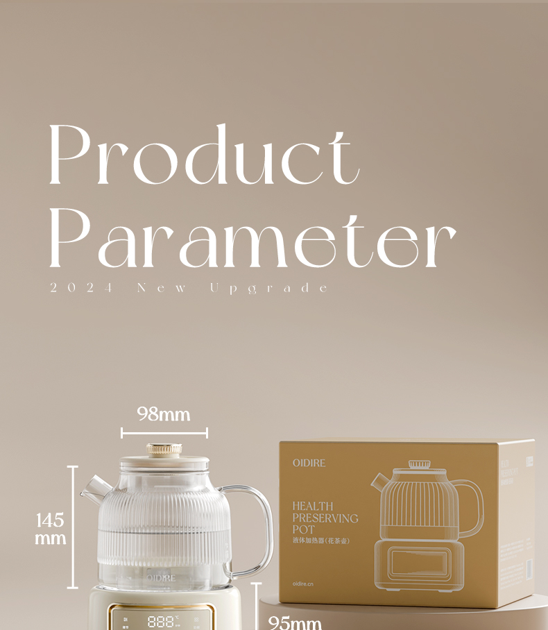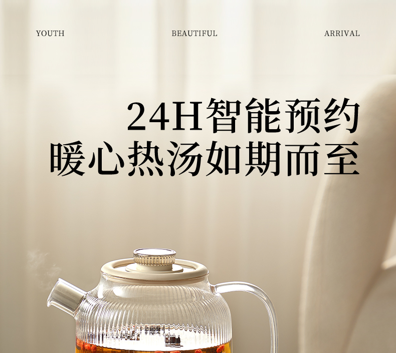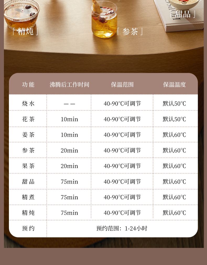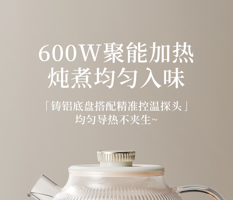 主要材质:PP+高硼硅玻璃 电压:220V 功率:600W 容量:1L 1、24小时智能预约,解放双手,无需等待 2、9大功能,多场景使用 3、精煮善炖,营养美味 4、IMD操作面板,背部控温探头 5、高硼硅玻璃内胆,材质安全放心,可视化烹煮 6、1000ML大容量,一壶满足 7、壶嘴茶漏设计,自动分离茶水和茶渍方便贴心 8、分离式设计,玻璃壶体易清洗
