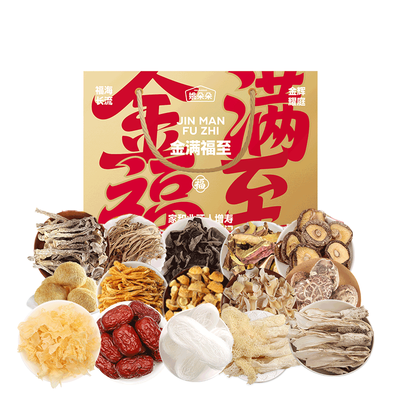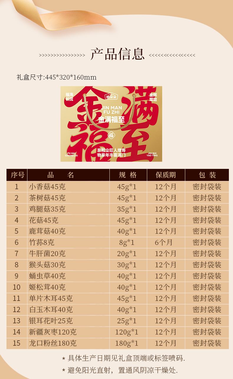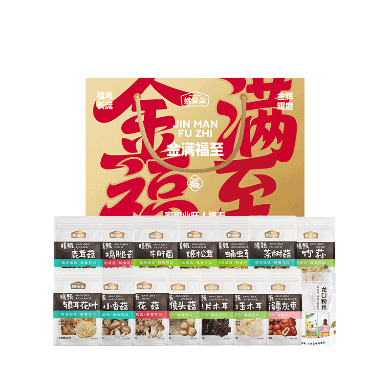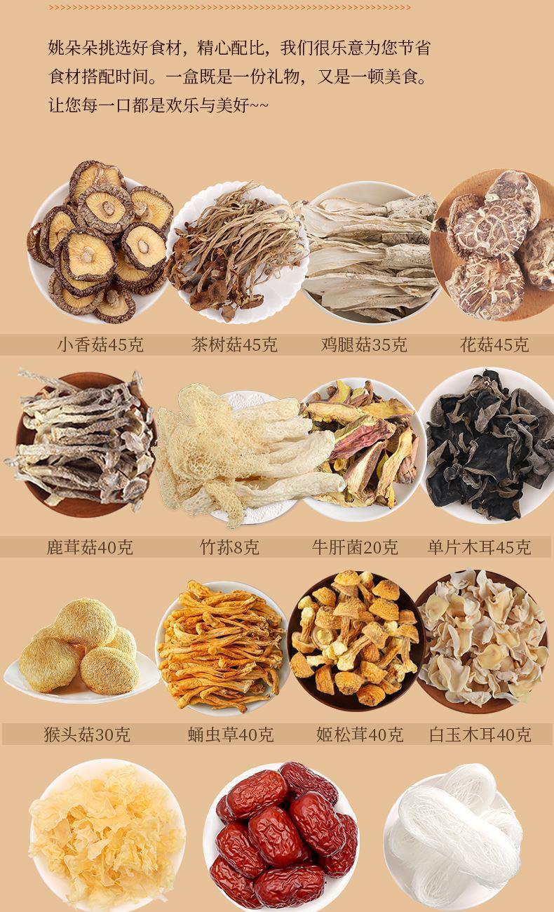 小香菇45克 茶树菇45克 鸡腿菇35克 鹿茸菇40克 牛肝菌20克 猴头菇30克 蛹虫草40克 姬松茸40克 单片木耳45克 白玉木耳40克 银耳花叶25克 花菇45克 竹荪8克 新疆灰枣120克 龙口粉丝180克 包装盒-金满福至