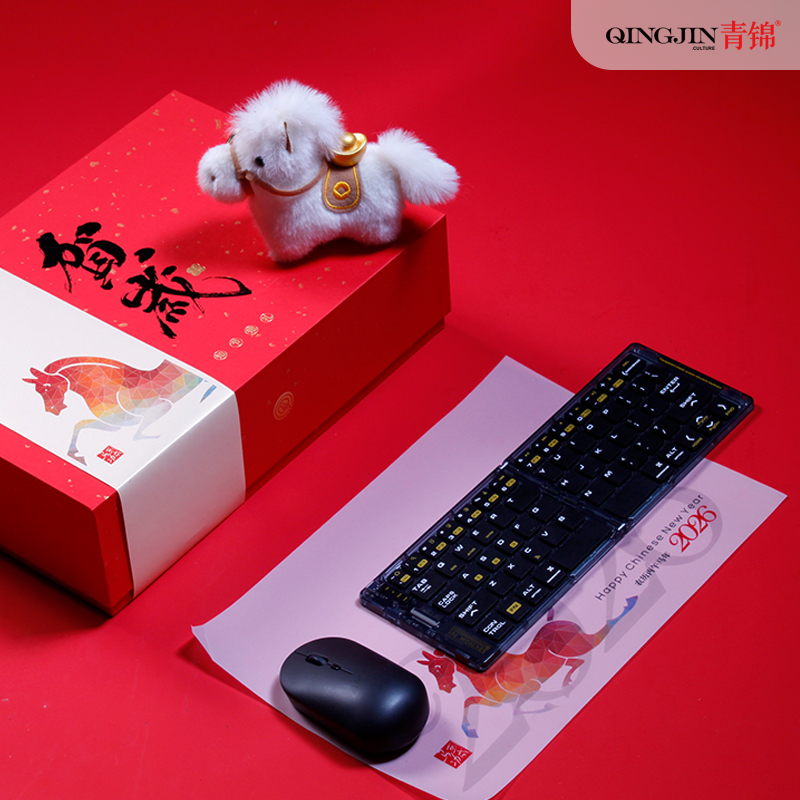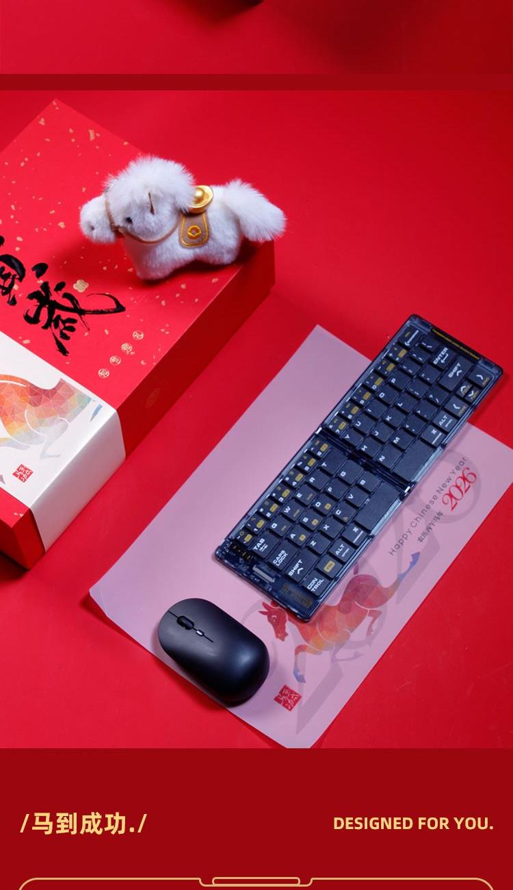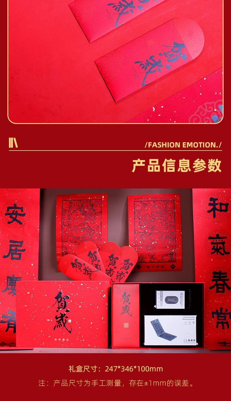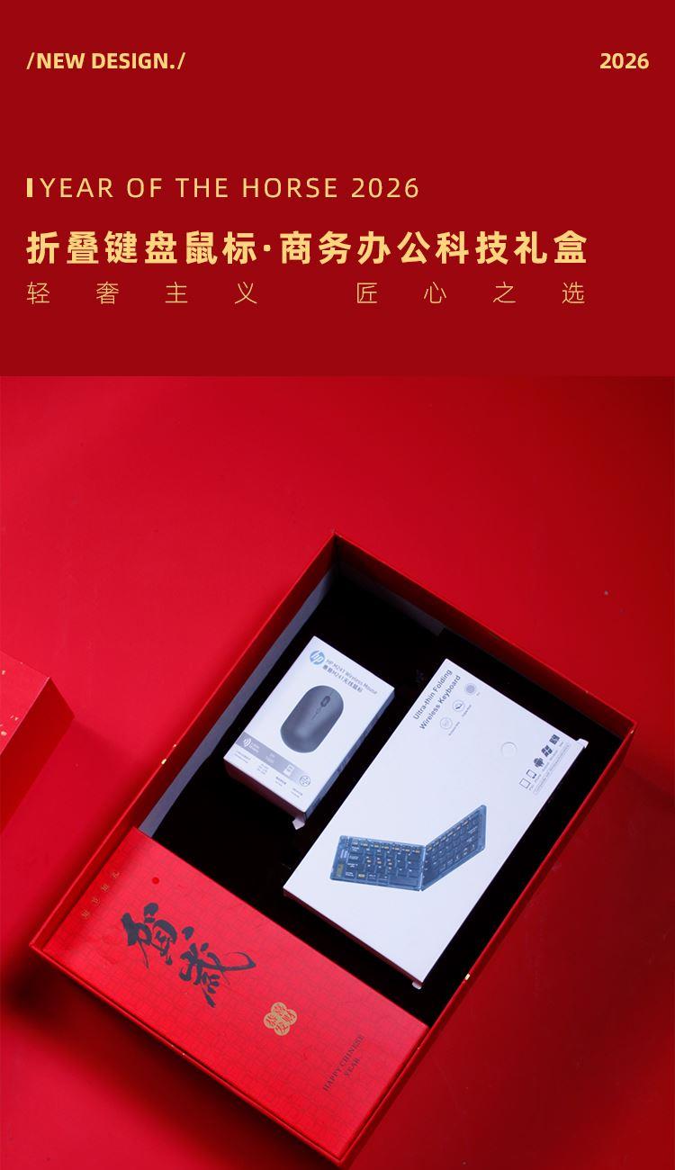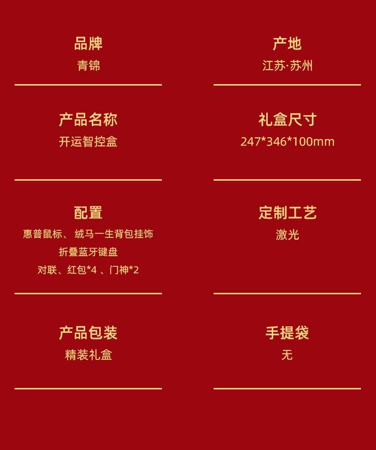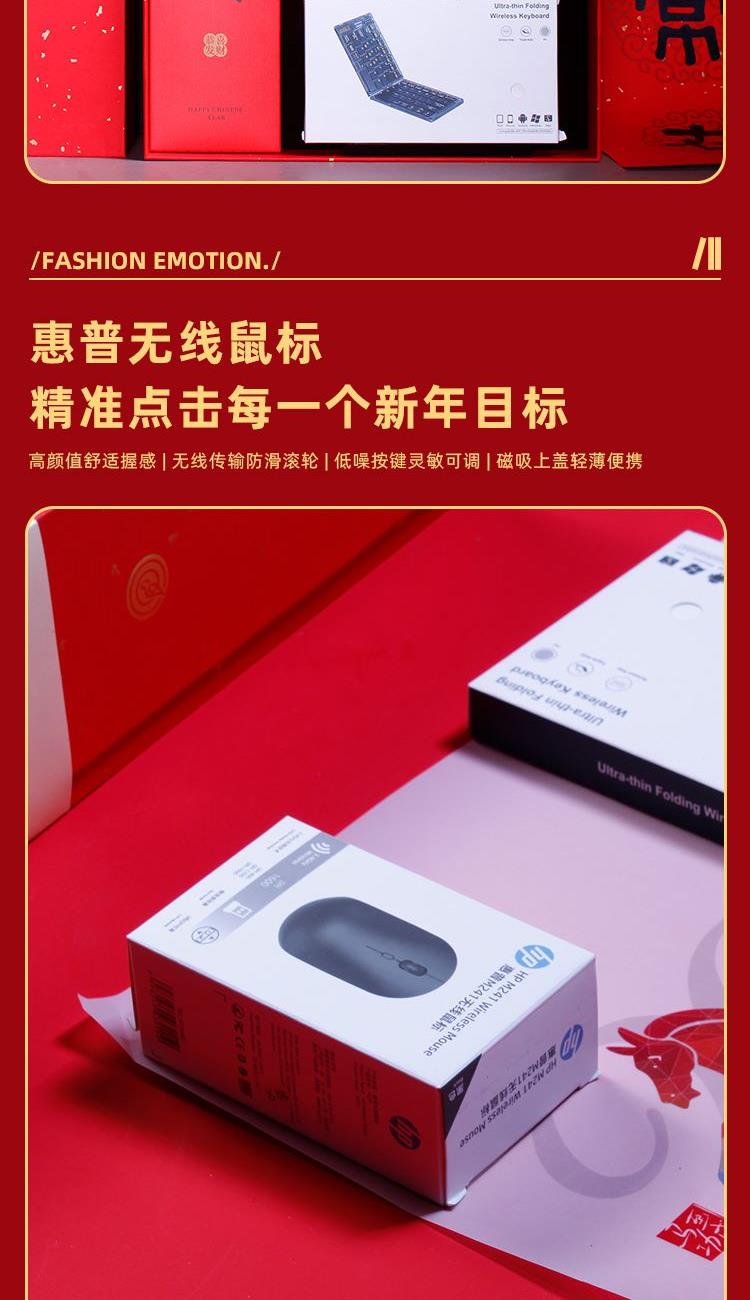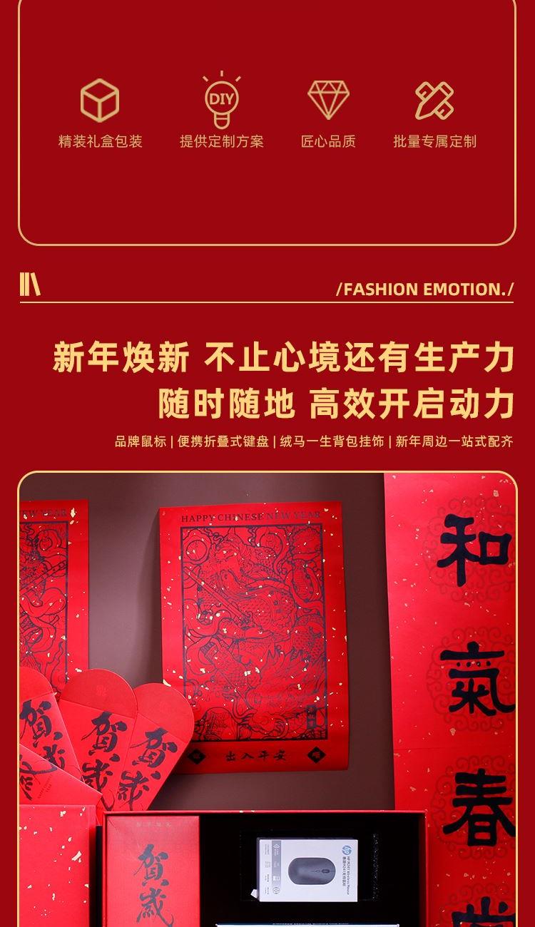 惠普鼠标*1 绒马一生背包挂饰*1折叠蓝牙键盘*1 对联*1-红包*4 门神*2 精装礼盒手提袋*1