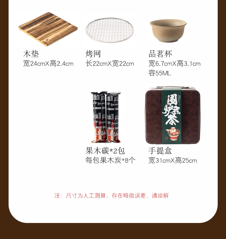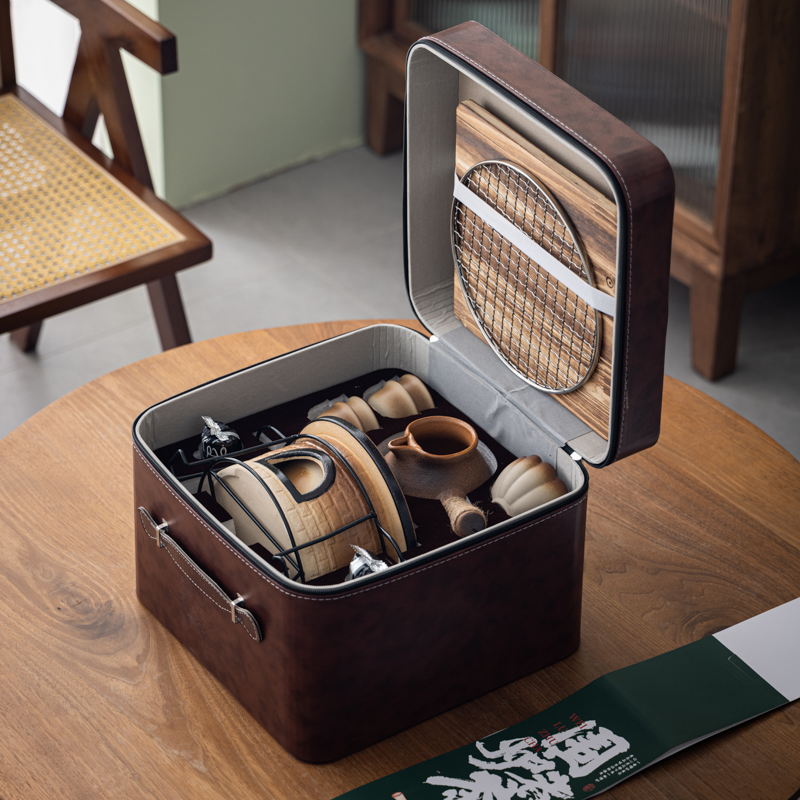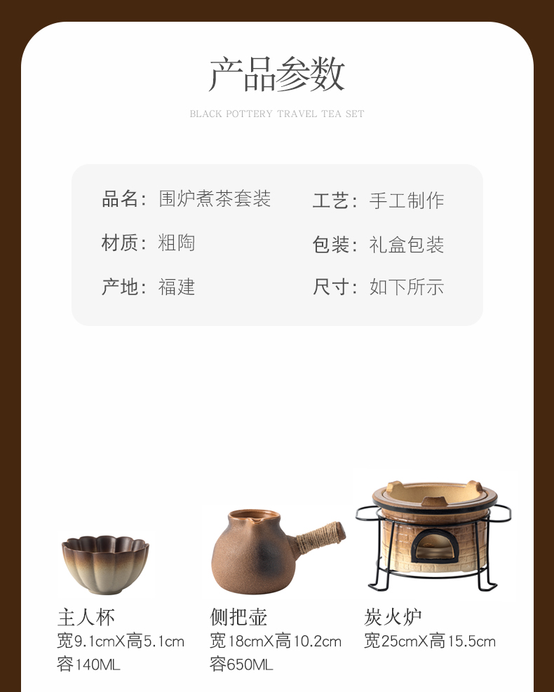 配置:一壶四个品茗杯 一个主人杯 一碳炉 一铁质炉架 一烤网 一木质底座 2包果碳 一旅行包 炭火炉:25*15.5厘米 壶:18*10.2厘米650ml 品茗杯: 6.7*3.1厘米55ml 旅行包:31*31*25厘米 天然矿物釉,高温烧制无铅镉 ,瓷胎密实不吸茶香,久用更显韵味,搭配礼盒包装,自用赠礼两宜,品质保障,甄选好礼。