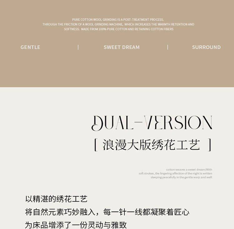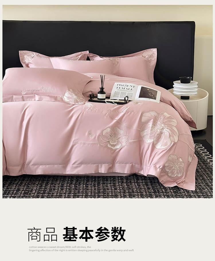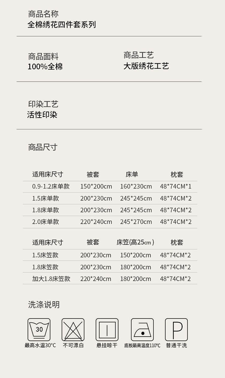 1:高支高密 新疆长绒棉 精选新疆全棉面料,触感柔软细腻带来如云朵般的亲肤体验,让每一次躺卧都成为与自然的温柔相拥 2:浪漫大版绣花工艺 以精湛的绣花工艺将自然元素巧妙融入,每一针一线都凝聚着匠心为床品增添了一份灵动与雅致 3:活性印染工艺耐洗涤 更柔软洁净 绿色活性印染 健康舒适亲肤 色织靓丽 耐水洗不易褪色手感更柔软舒适 尺寸:被套:200*230cm*1 床单:245*245cm*1 枕套:48*74cm*2 包装:礼盒