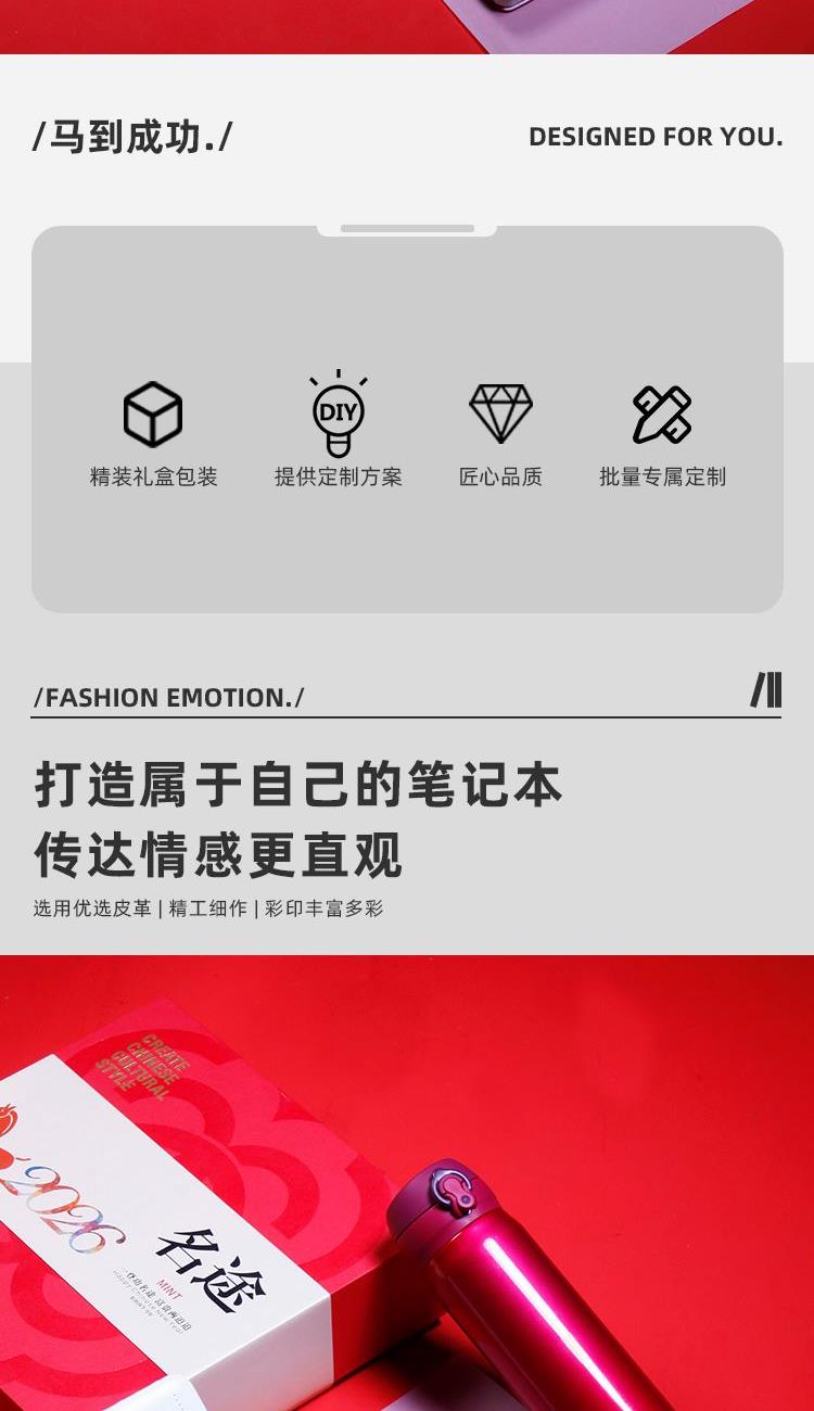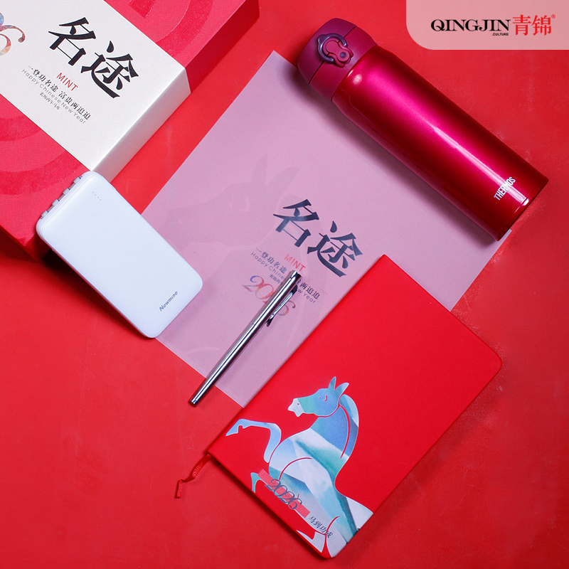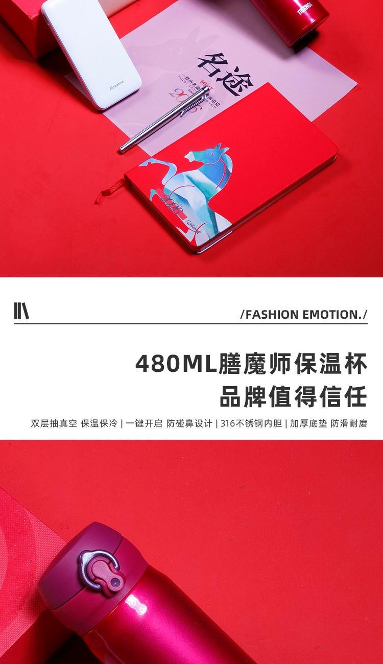 配置 膳魔师保温杯480ML*1 青马笔记本*1 颜色黑色/红色/彩印色 签字笔*1 纽曼移动电源*1 白色 手提袋套*1 精装礼盒*1 材质 保温杯:304钢 签字笔:abs 笔记本:皮革千越象牙白纸100克80张 尺寸 笔记本:130*212mm 保温杯:220*60*60mm 礼盒:272*272*83mm